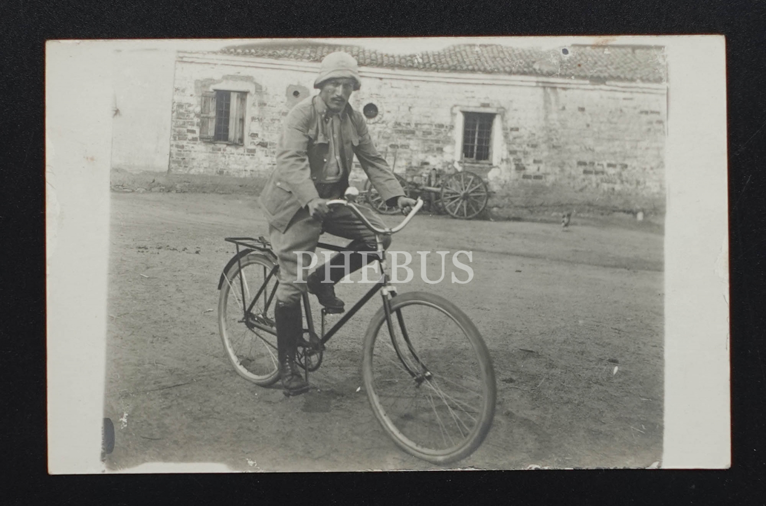 Birinci Dünya Savaşı yıllarından bisiklet üstünde hatıra fotoğrafı çektiren Osmanlı askeri, 14x9 cm...