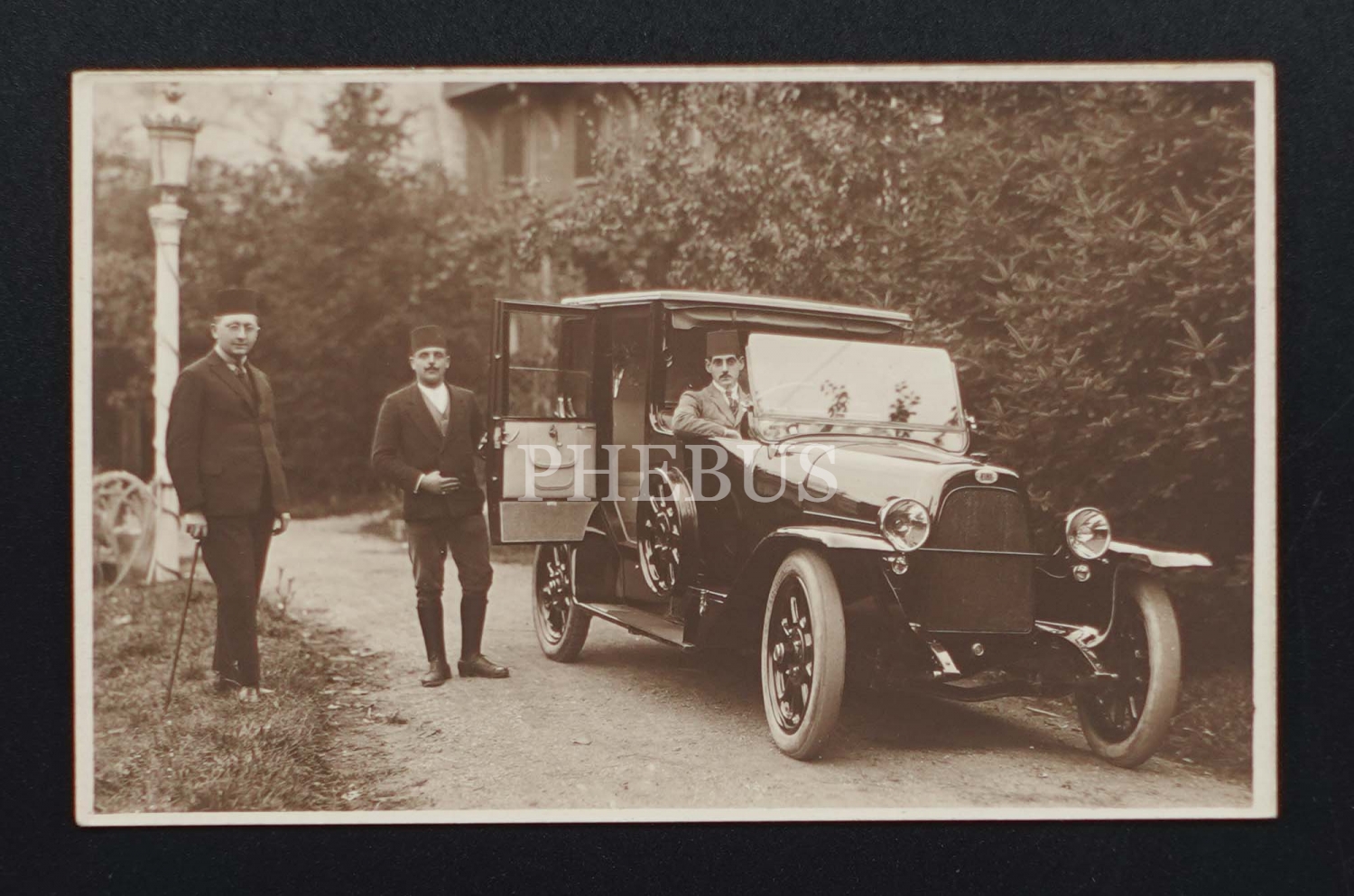 Osmanlı döneminden Fiat marka otomobille hatıra fotoğrafı çektiren fesli beyefendiler, 14x9 cm...