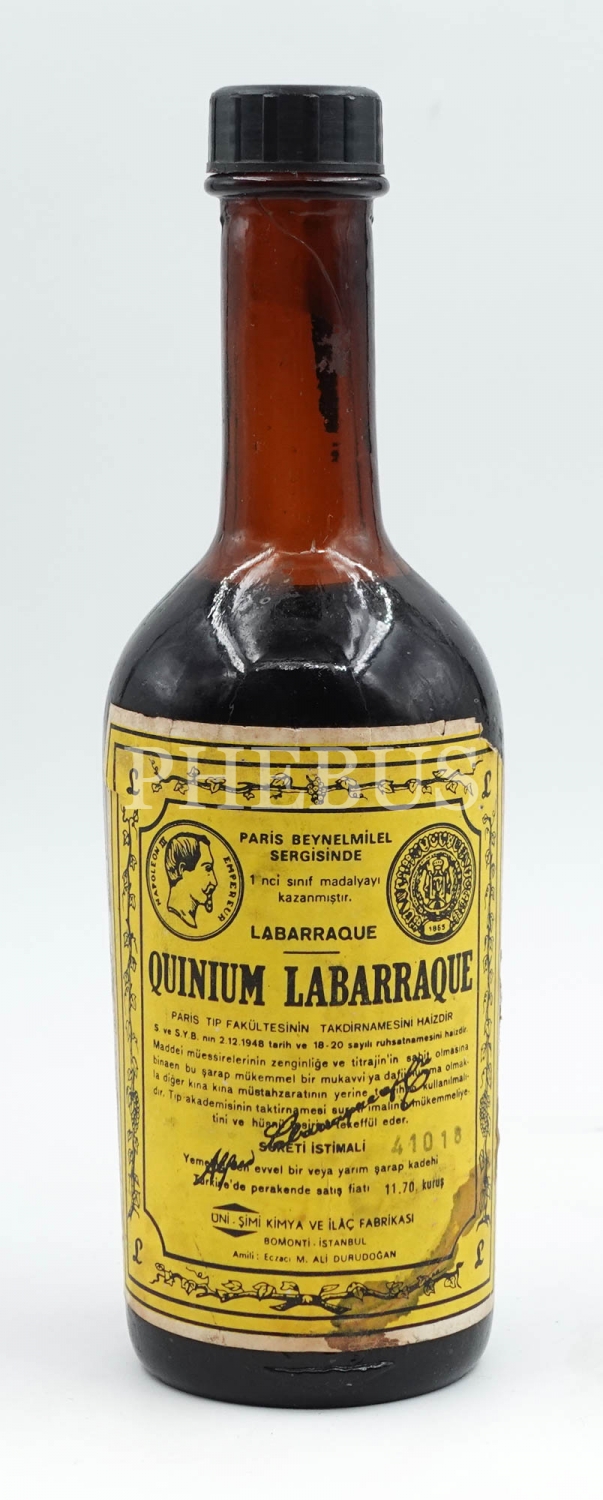 Quinium Labarraque şişesi (dolu), Uni-Şimi Kimya ve İlâç Fabrikası (Bomonti - İstanbul), 21x6 cm...