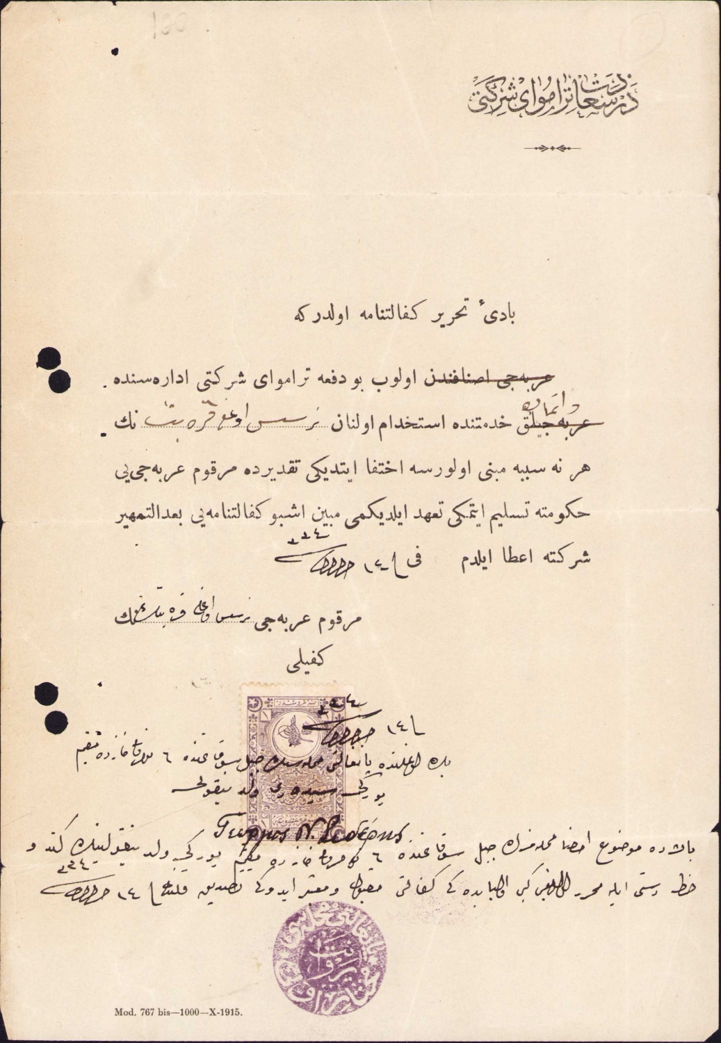 Osmanlıca Dersaadet Tramvay Şirketi antetli kefaletname konulu 1334 tarihli evrak, 16x24 cm