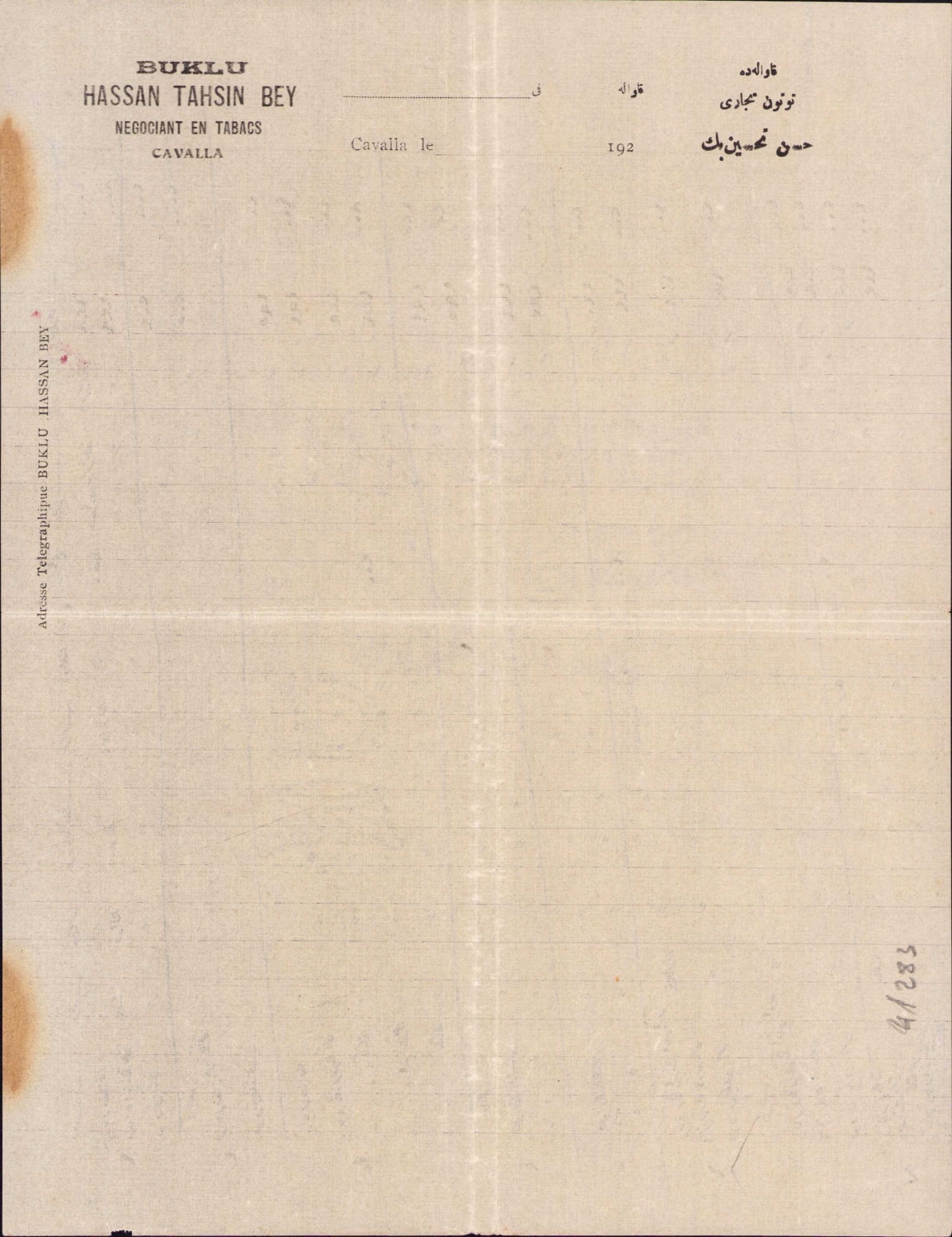 Osmanlıca - Fransızca Kavala Tütün Tüccarı Hasan Tahsin Bey antetli doküman, 21x28 cm