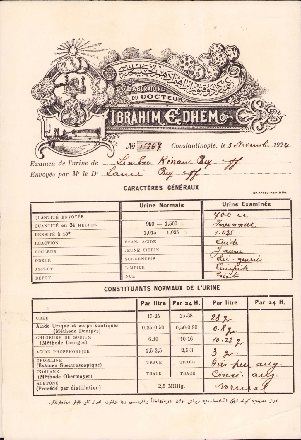 Osmanlıca - Fransızca Kimyager Doktor İbrahim Ethem Tahliyelhanesi (laboratuvar), 1924, 34x24 cm