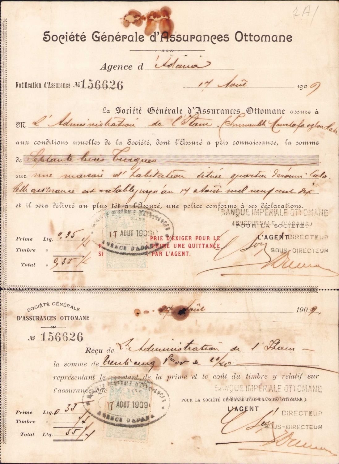 Fransızca Societe Generale d'Assurances Ottomane antetli makbuz 1909, 19x27 cm