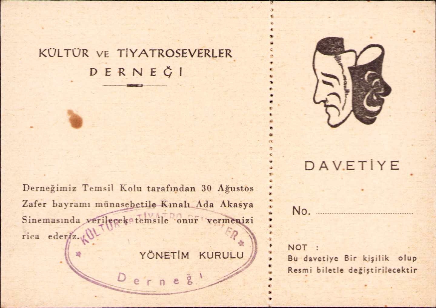 Kültür ve Tiyatro Severler Derneği davetiyesi, 11x7 cm