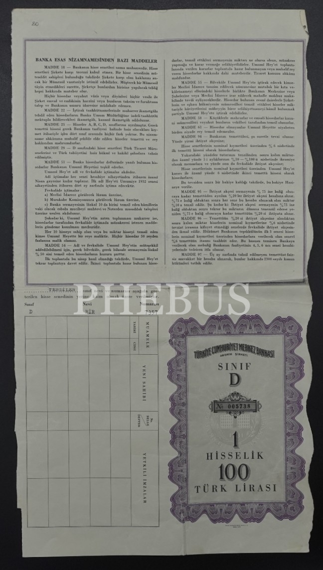 Türkiye Cumhuriyet Merkez Bankası AŞ, 1931 Tarihli Bir Paylık Hisse Senedi