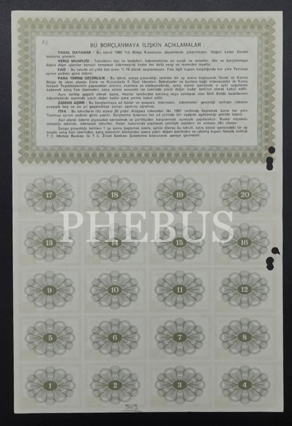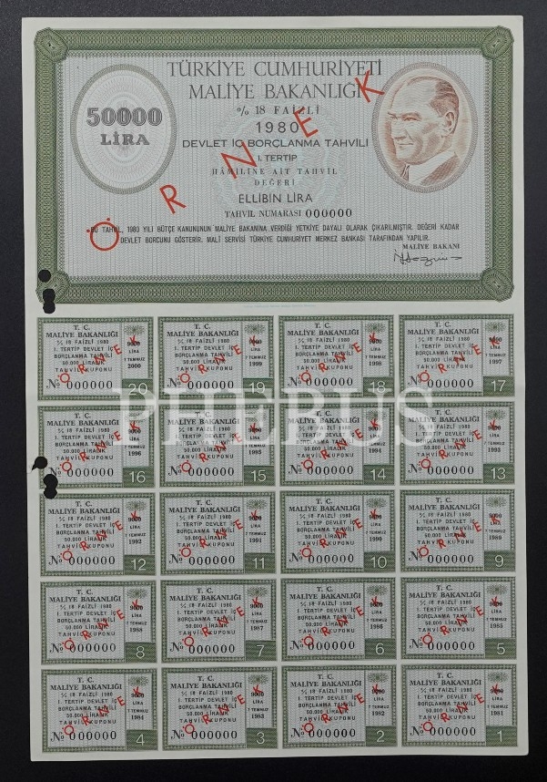 Türkiye Cumhuriyeti Maliye Bakanlığı 1980 Yılı Atatürk Görselli 50.000 Lira Değerinde Specimen Devlet Tahvili