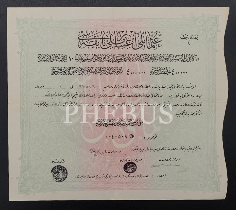 Osmanlı İtibarı Milli Bankası Anonim Şirketi, 1916 Tarihli Bir Paylık Hisse Senedi