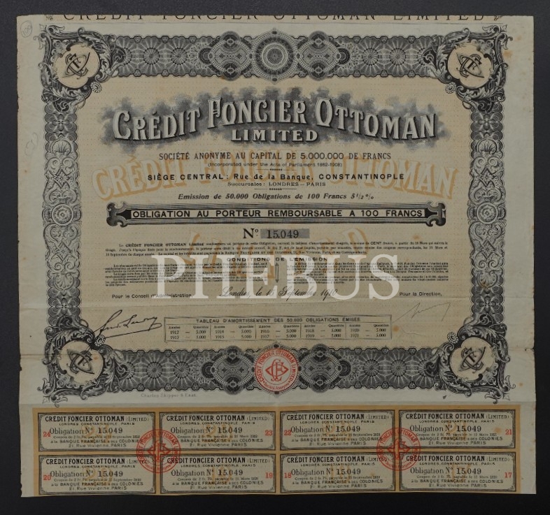 CREDIT FONCIER Osmanlı Emlak ve İkrazat Bankası, 1910 Tarihli Bir Paylık Hisse Senedi