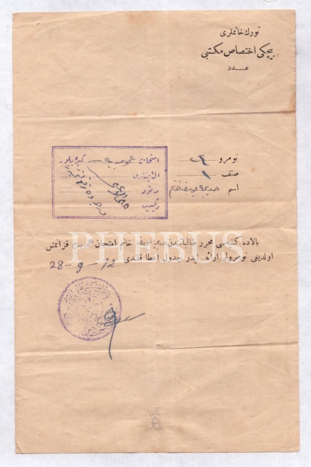 Hatice Belkıs Hanım´ın Türk Hanımları Biçki İhtisas Mektebi´nde yapılan sınavdan başarılı olduğunu beyan eden evrak, 13x20 cm...