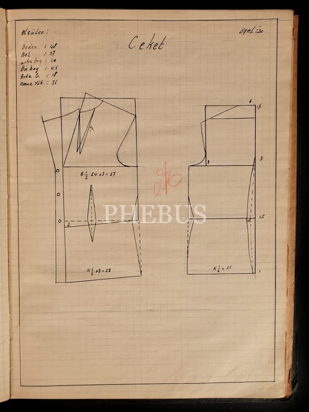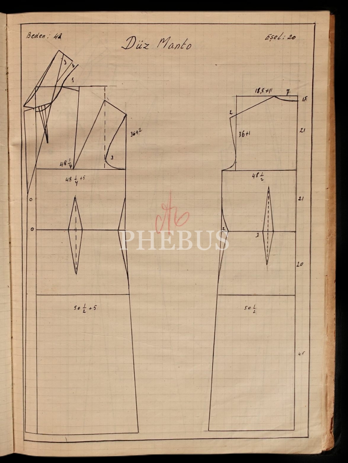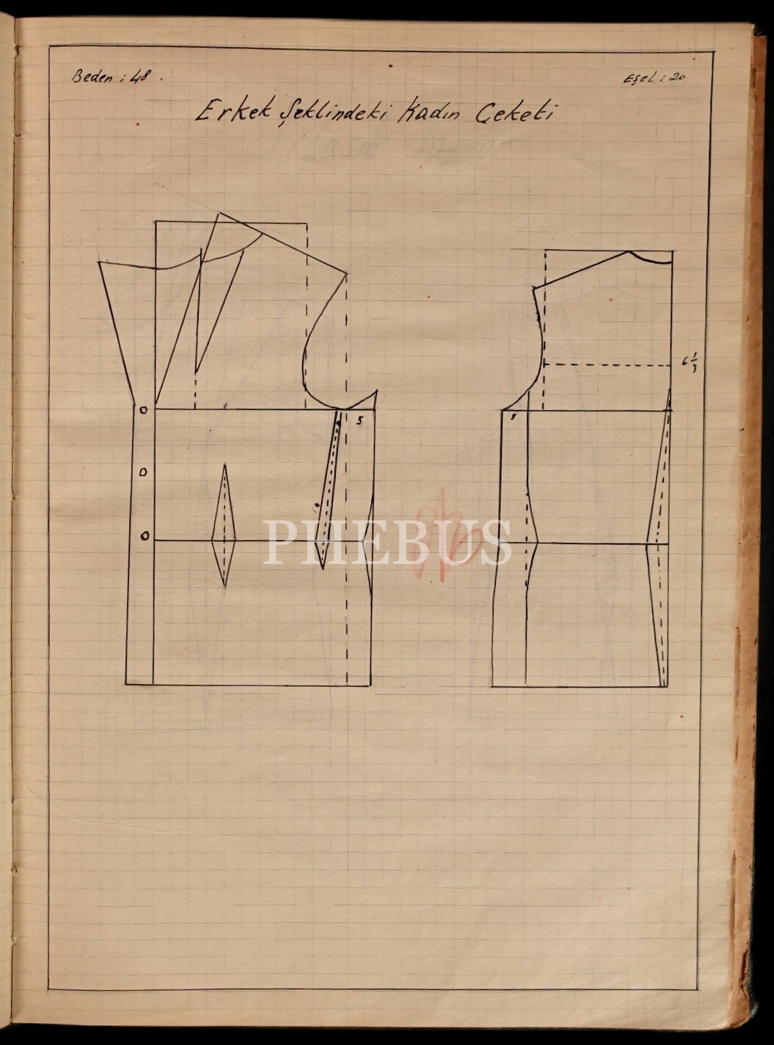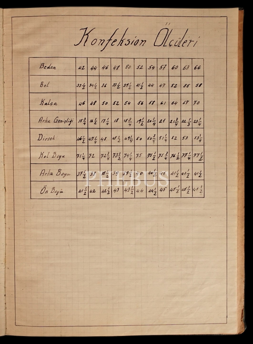 Tüm sayfaları dolu defterde yer alan çalışmalardan bir kısmı: Çocuk Pantolunu, Dar Etek, Pijama Ceketi, Şort, Erkek Gömleği, Tayyör...