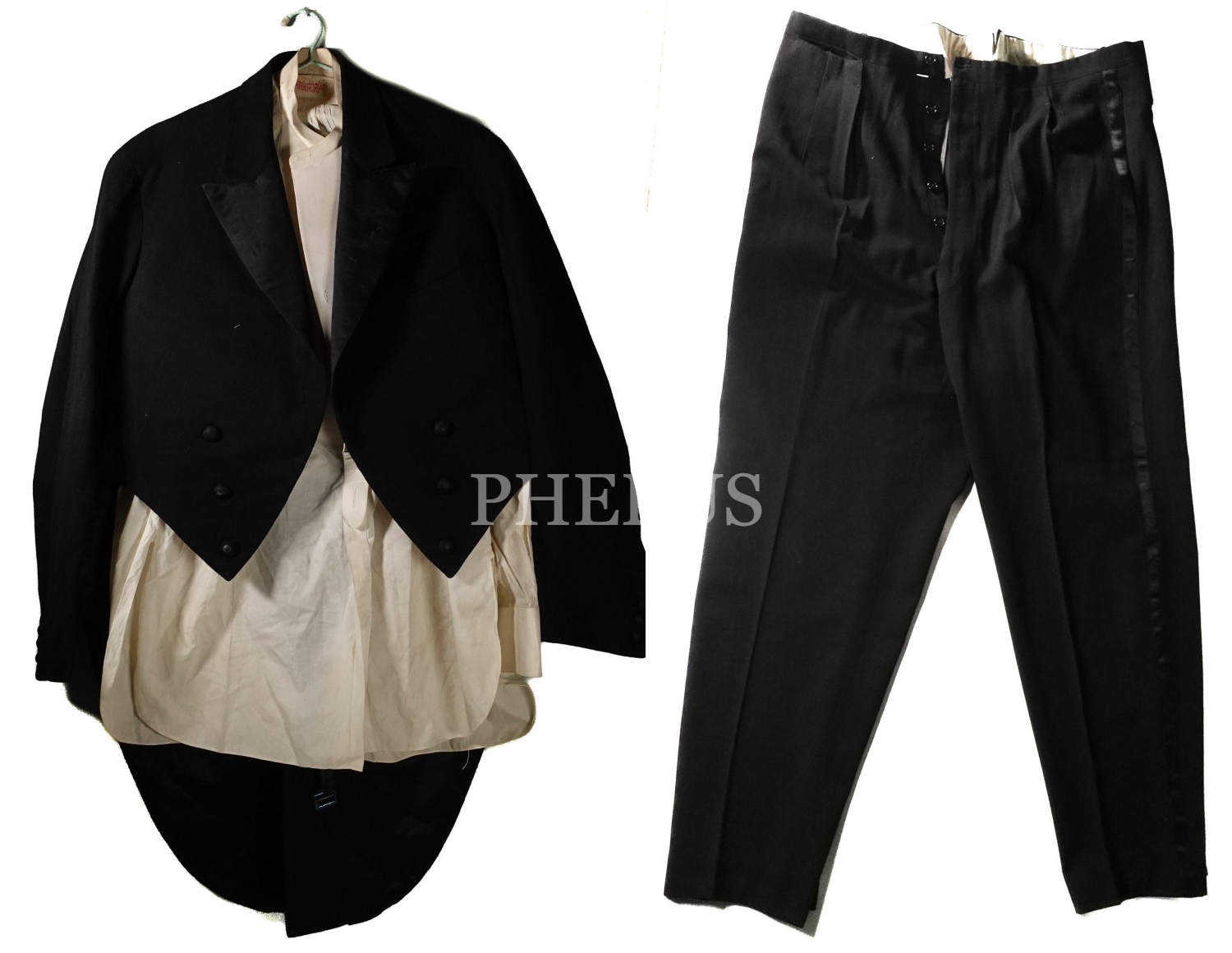 Osmanlıca-Fransızca J. Piliouris (Pera, Constantinople) etiketli frak ile Sronguilo Freres (Constantinople) etiketli ve "R.B." inisiyalli gömleğin yer aldığı frak takımı (ceket, gömlek, gömlek yakası, kuşak, pantolon)...