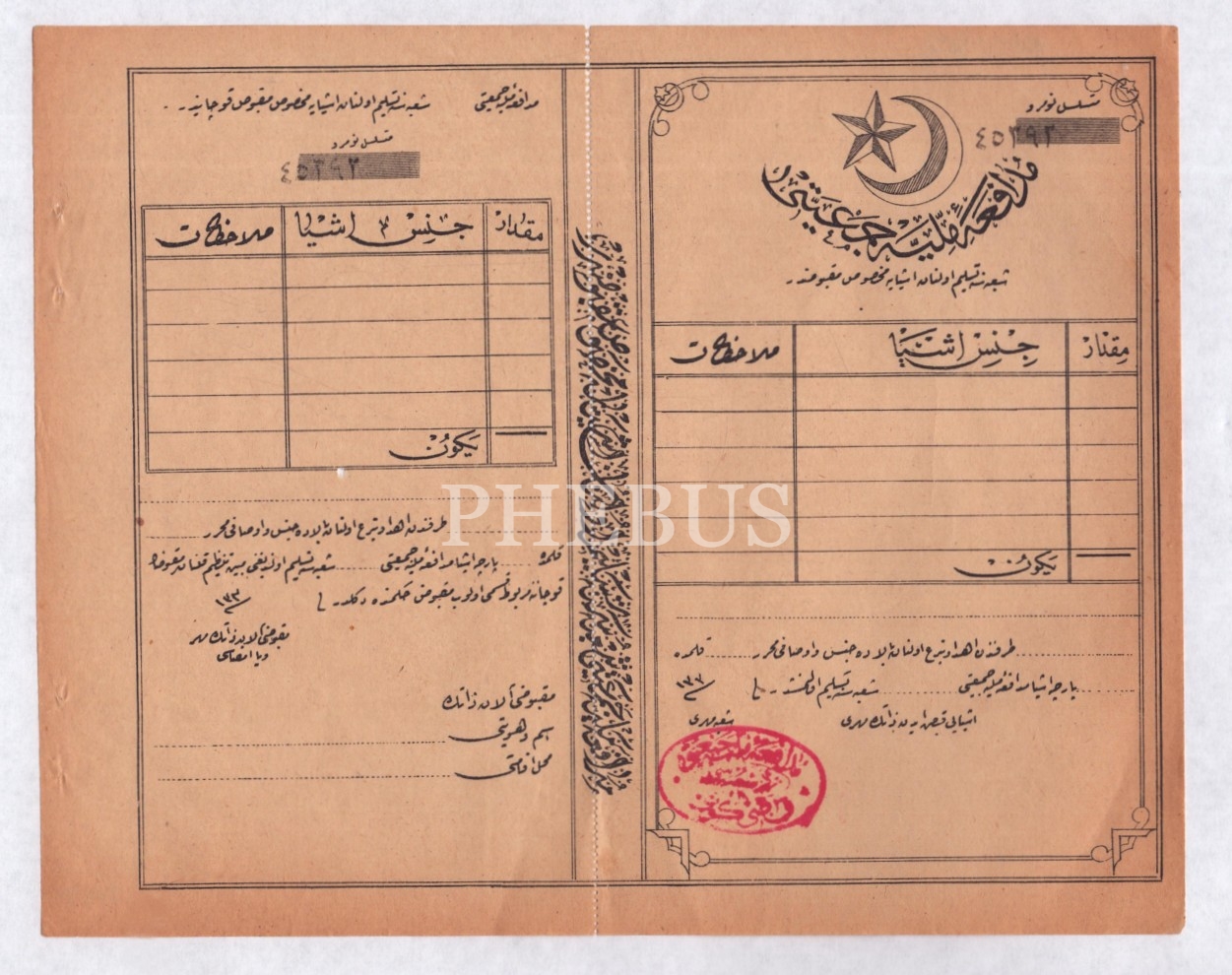 Müdafaa-i Milliye Cemiyeti´ne bağışlanan eşyanın doldurulmamış (boş) makbuzu, Müdaafa-i Milliye Cemiyeti Kadıköy Şubesi mühürlü, 26x21 cm...