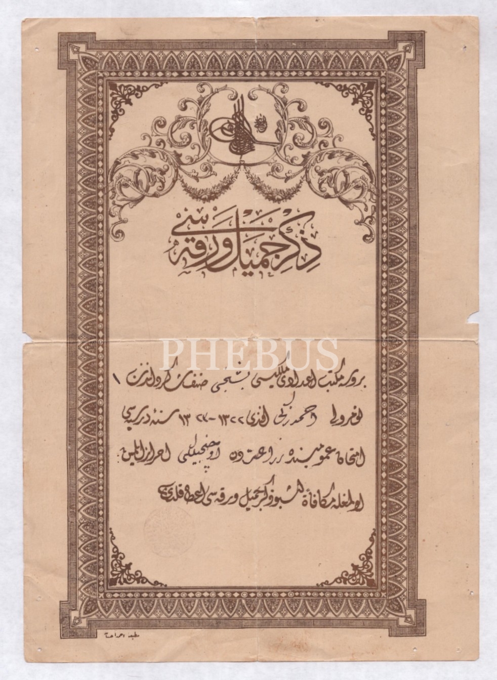 Bursa Mekteb-i İdadi Mülkiyesi öğrencilerinden Ahmed Zeki Bey´in imtihanda 3. olması dolayısıyla verilen II. Abdülhamid tuğralı Zikr-i Cemil (Güzel hatırlanma) evrakı, 20x28 cm...