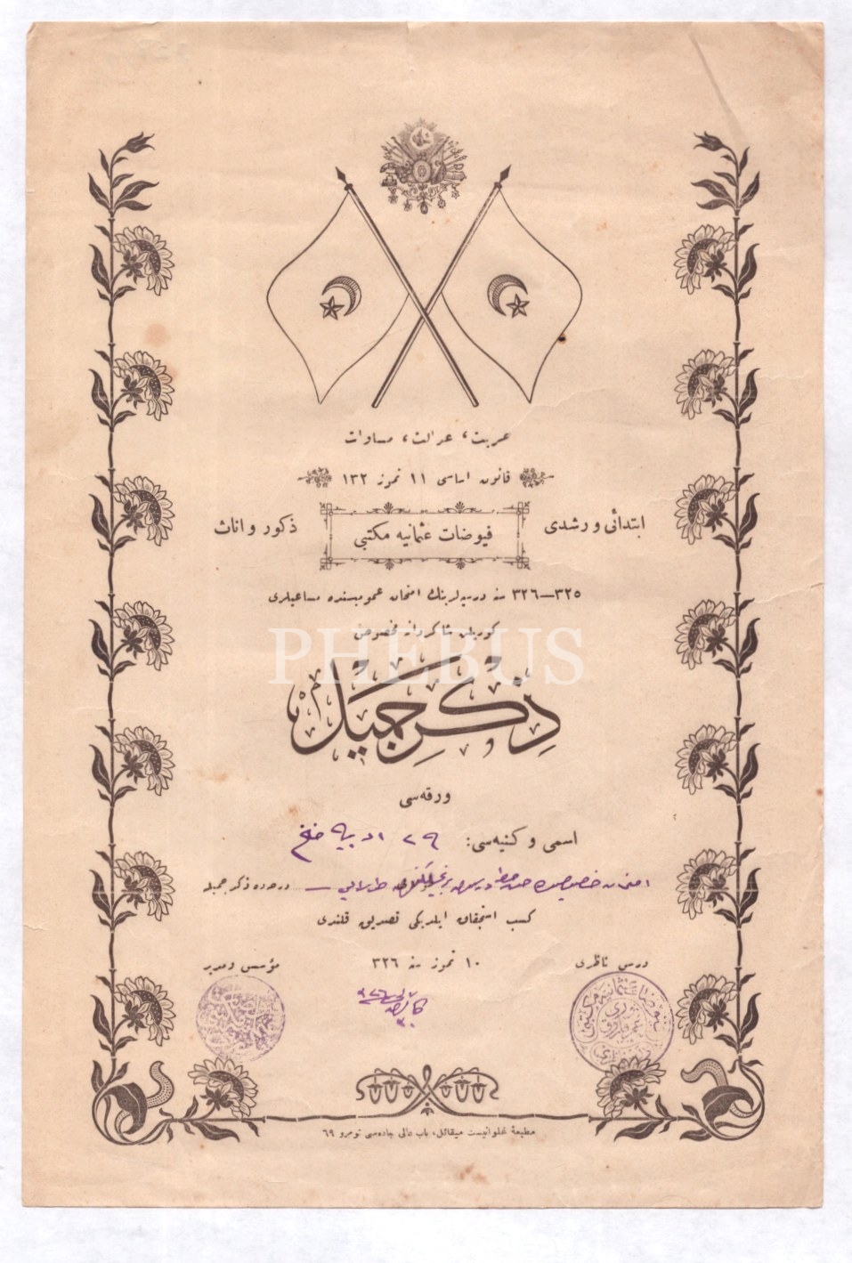 Füyuzat-ı Osmaniye Mektebi öğrencilerinden Edebiye Hanım´a verilen okulun mührünü taşıyan Zikr-i Cemil varakası, 20x30 cm...