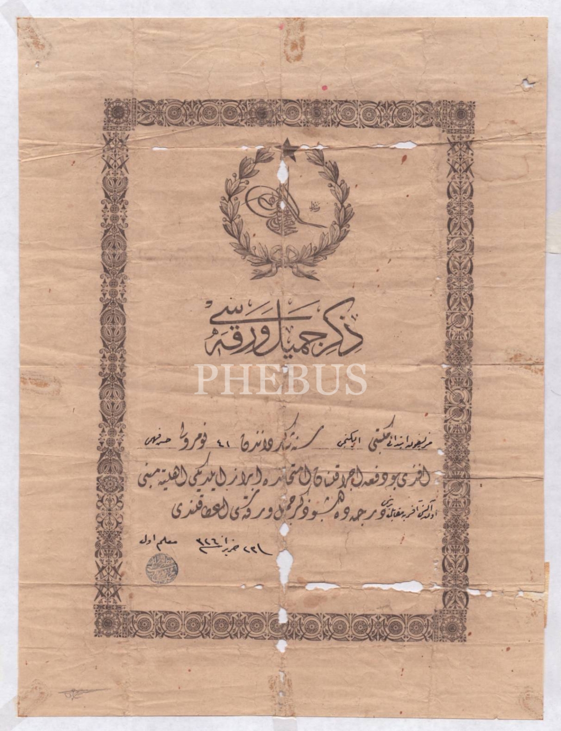 Zikr-i cemil varakaları bir imtihan neticesinde birinciliği elde edememiş başarılı öğrencilerin daha fazla çalışarak mükafat elde etmelerini teşvik etmek amacıyla verilirdi. Fakat bu belgenin zaman zaman çeşitli imtihanlarda kazanılan başarılar vesilesiyle verildiği de olurdu. *Katlanma kısımlarında yıpranmalar mevcuttur.