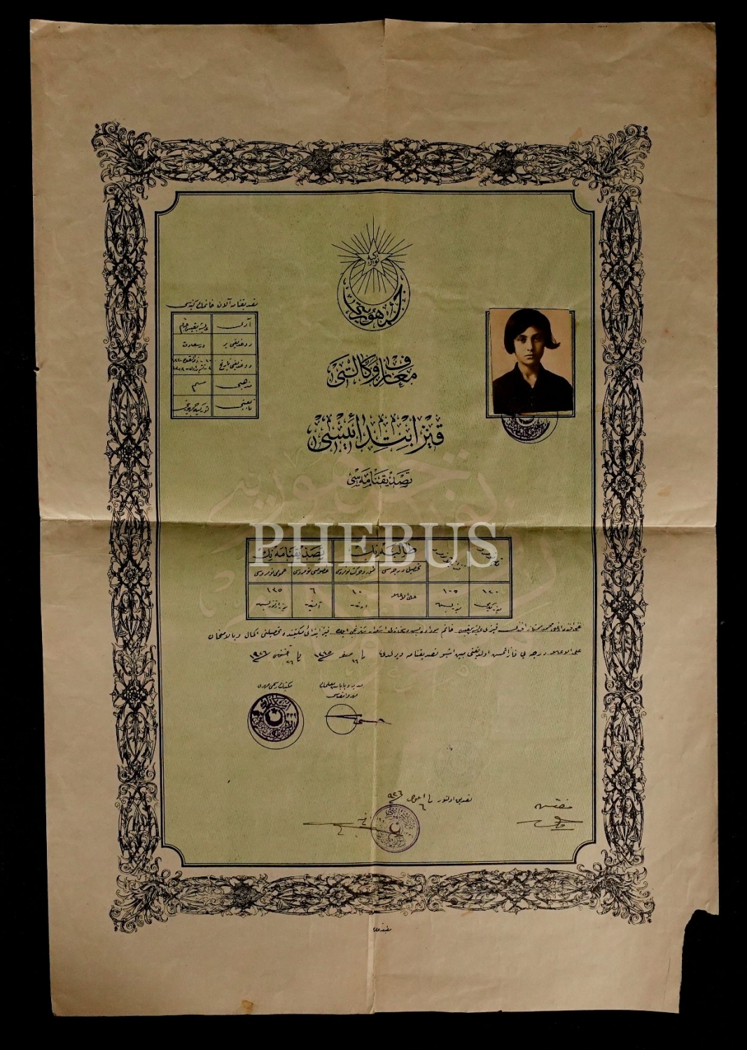 Üsküdar (İstanbul) Sekizinci Kız İptidaiyesi Mektebi´nden mezun olan Ayşe Belkıs Hanım´ın 1926 tarihli fotoğraflı diploması, 35x50 cm...