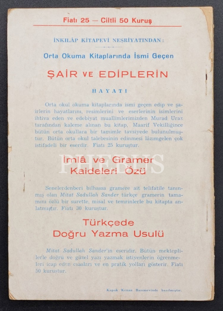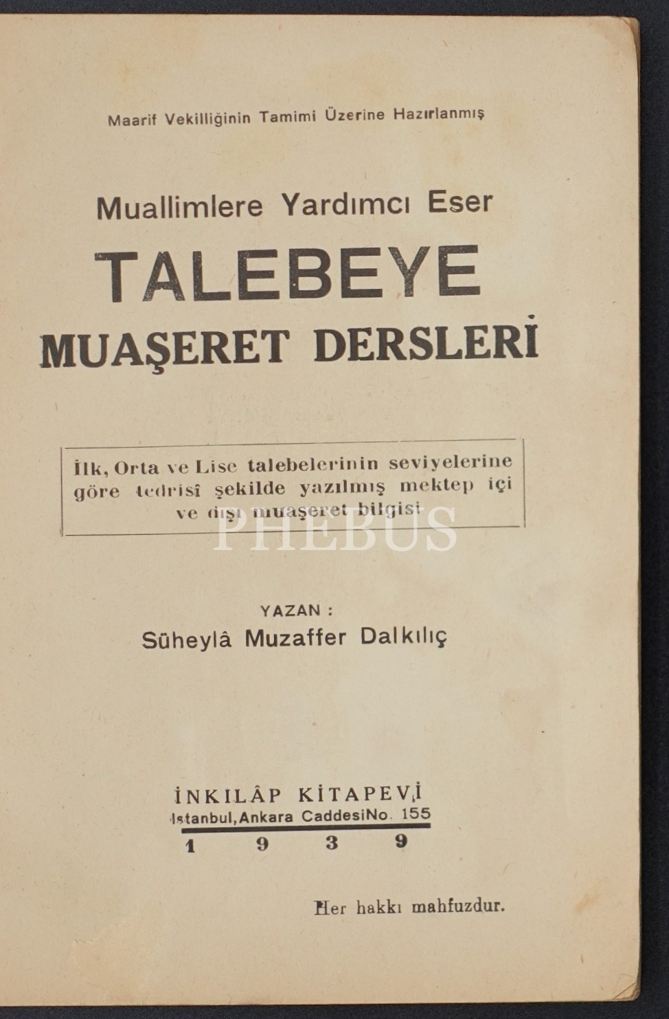 TALEBEYE MUAŞERET DERSLERİ, Süheyla Muzaffer Dalkılıç, 1939, İnkılap Kitabevi, 83 sayfa, 14x20 cm...