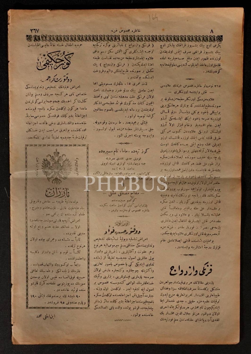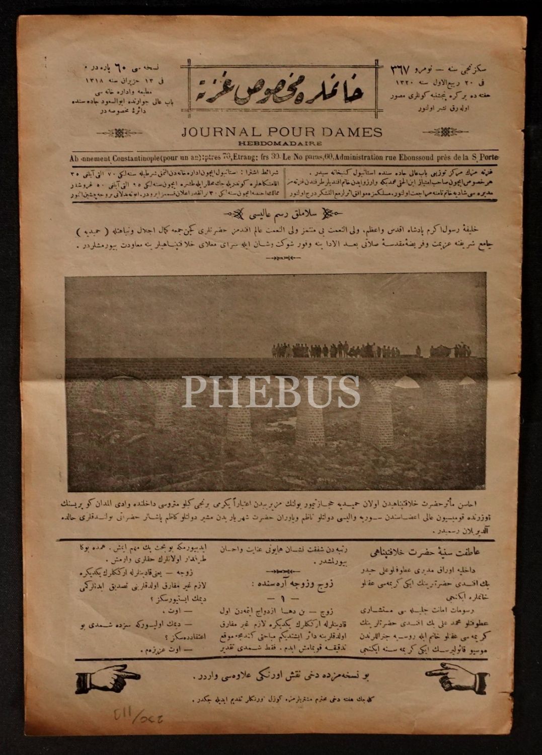 Kapağında Hicaz Demiryolu üzerinde bulunan bir köprünün teftişini gerçekleştiren komisyonun hatıra fotoğrafı yer alan HANIMLARA MAHSUS GAZETE´nin 20 Rebiülevvel 1320 tarihli 367. sayısı, 12 sayfa, 26x36 cm...