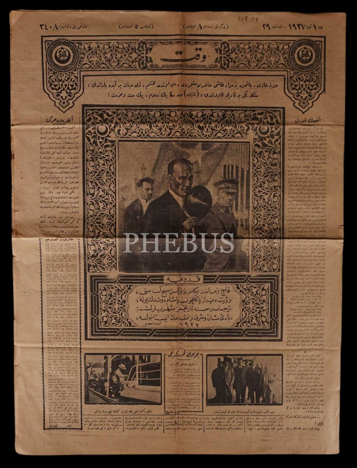 Mustafa Kemal Atatürk'ün tam 8 sene sonra İstanbul'a ilk gelişini manşetine taşıyan VAKİT gazetesinin 29 Zilhicce 1927 tarihli nüshası, 4 sayfa, 46x62 cm...