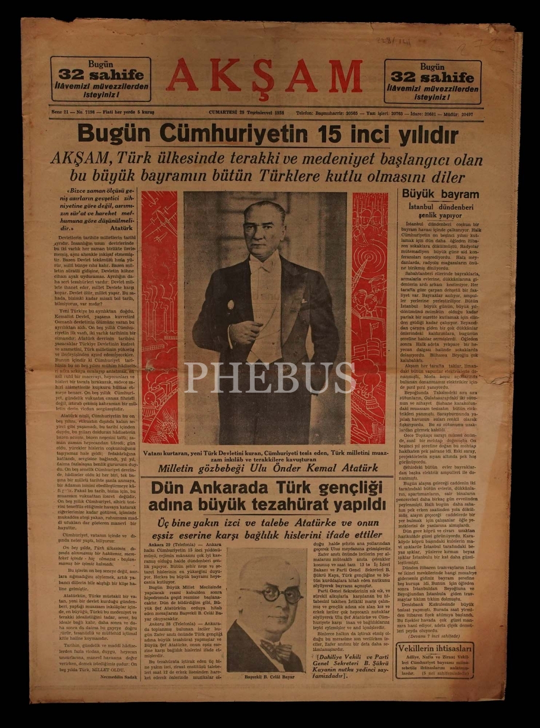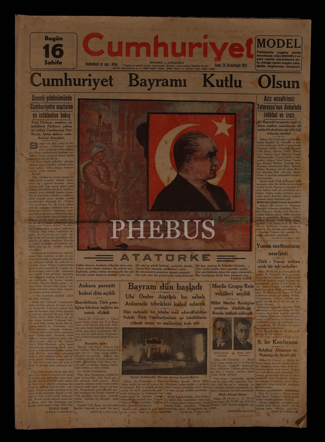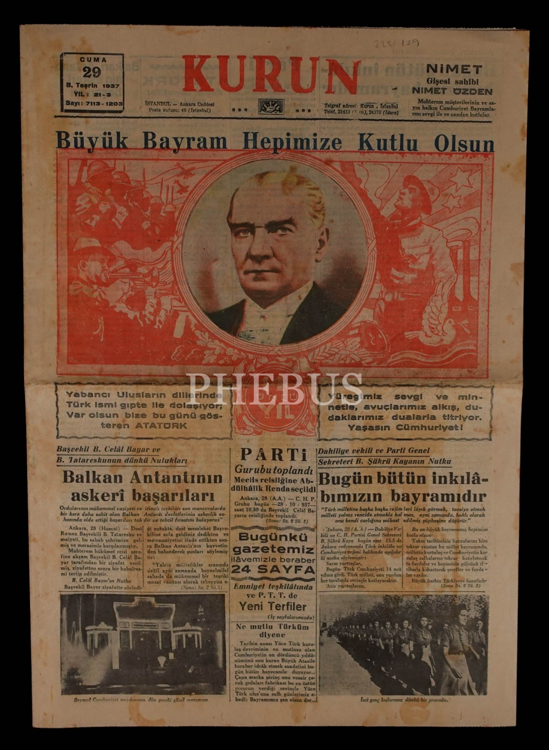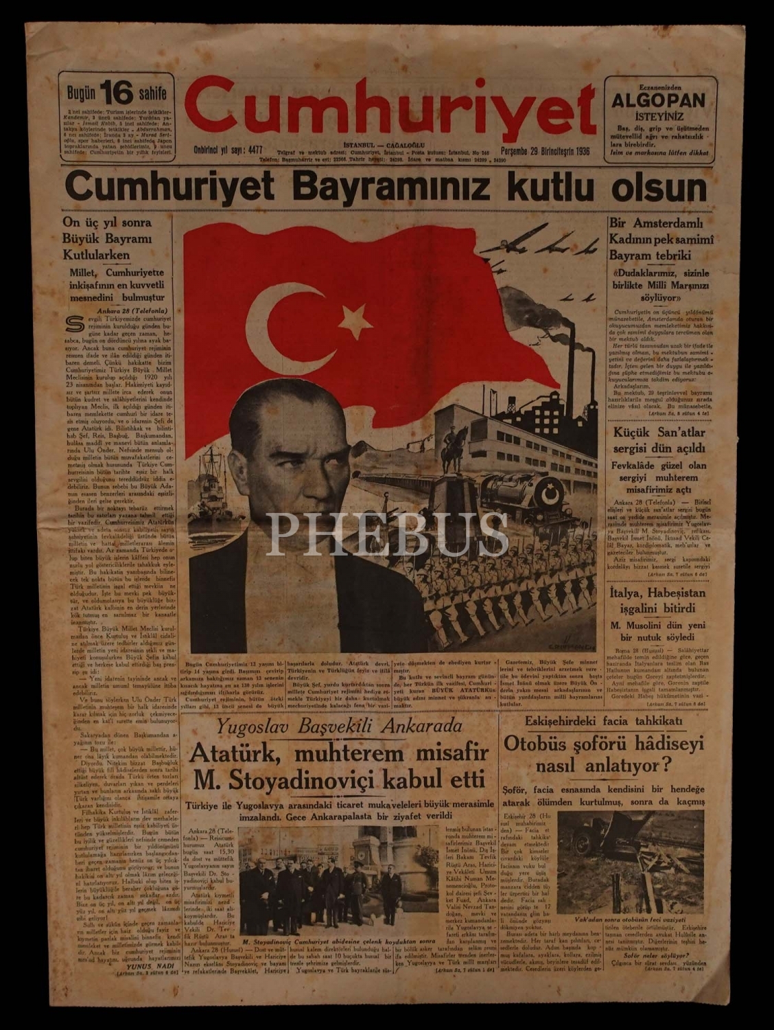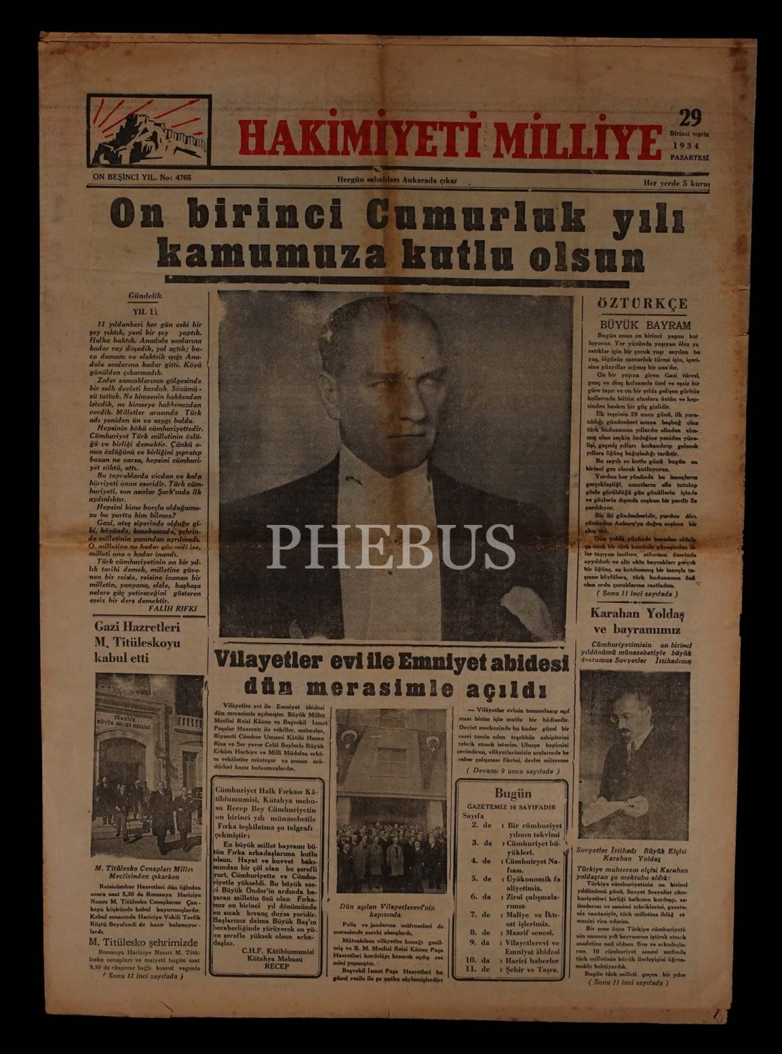 1933 senesinden 1938 senesine kadar Cumhuriyet´in yıldönümüne özel olarak yayımlanan, her birinin kapağında Mustafa Kemal Atatürk ve Cumhuriyet´e dair çeşitli görsellerin yer aldığı 12 adet gazete. Gazeteler: Haber (1936-1938), Cumhuriyet (1936-1937-1938), Akşam (1933-1936-1937-1937), Açık Söz (1936), Kurun (1937), Son Posta (1933-1936-1937), Diyarbekir (1934), Kastamonu (1936), Hakimiyet-i Milliye (1934)