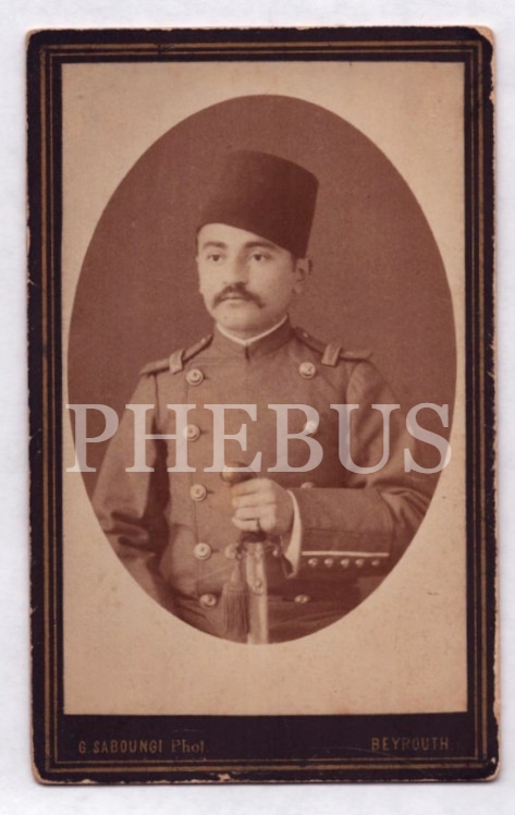 Kılıçlı Osmanlı subayının stüdyo hatıra fotoğrafı, G. Saboungi Fotoğrafhanesi (Beyrut, Suriye), 7x11 cm...
