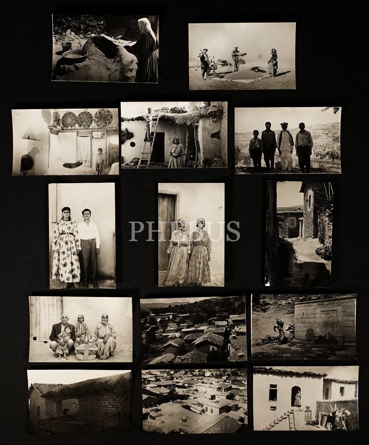 Erken Cumhuriyet döneminde Hatay´ın dört bir köşesinde bulunan köylerden, farklı dini inançlara ve etnik kökenlere sahip insanlarının sosyal hayatındandan kareler ve köylerden manzara kesitleri içeren 14 adet fotoğraf, 14x9 cm...