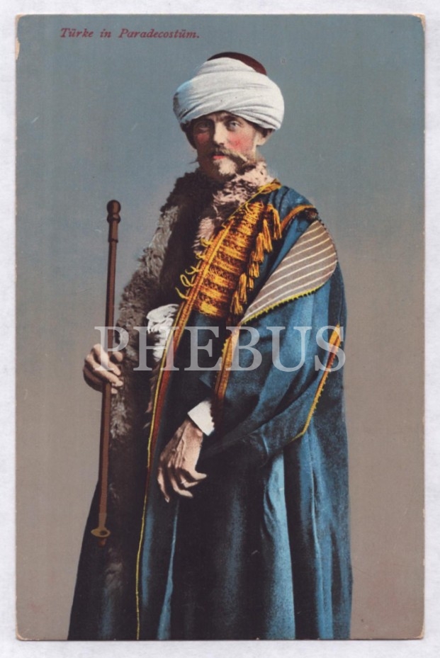 Yöresel kıyafetler içerisinde bir Osmanlı, "Türke in Paradecostüm), ed.: Pacher & Kisic, Mostar (Bosna Hersek), 14x9 cm...