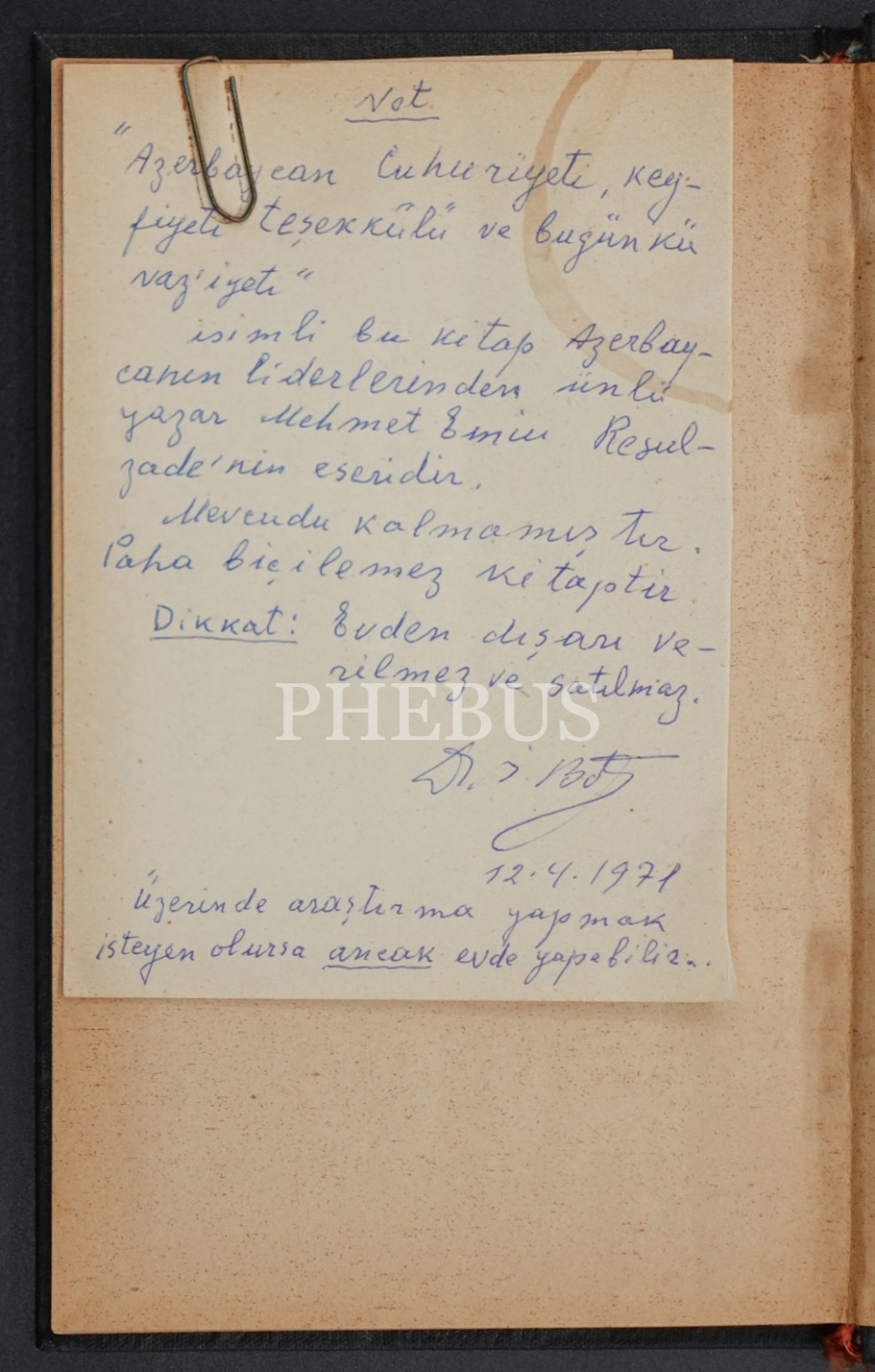 Kitabın içerisinde ilk sahibinin kitabın mevcudu kalmayan, paha biçilemez bir eser olduğunu ve eserin satılmaması hatta evden çıkarılmaması gerektiğini ifade eden notu yer almaktadır.