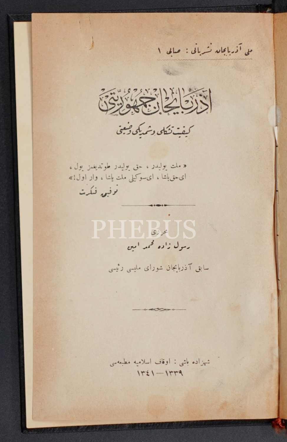 AZERBAYCAN CUMHURİYETİ KEYFİYET-İ TEŞEKKÜLÜ VE ŞİMDİKİ VAZİYETİ, Resulzade Mehmed Emin, 1341, Evkaf-ı İslamiye Matbaası, 166 sayfa, 14x21 cm...
