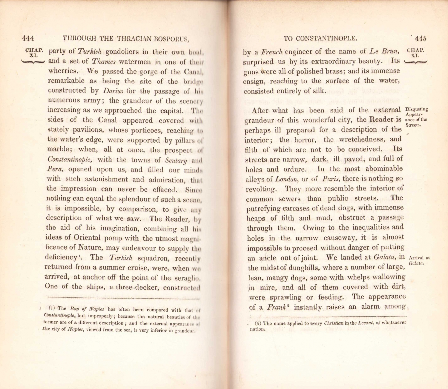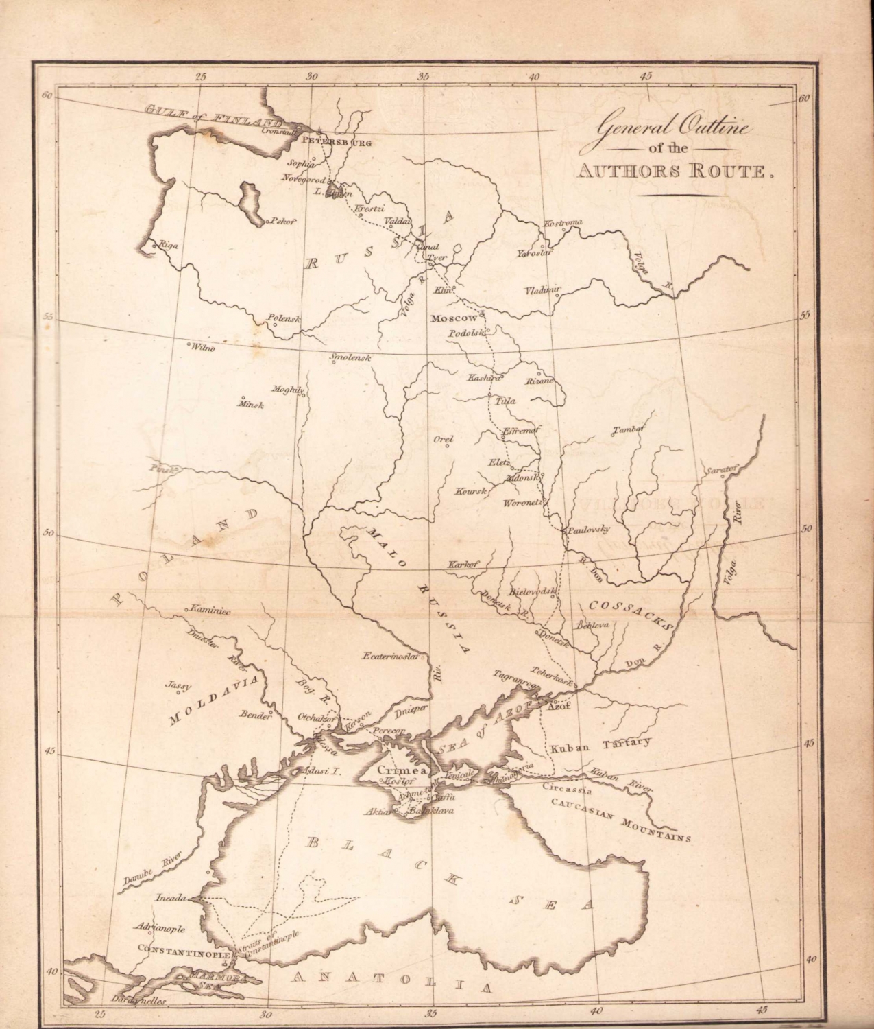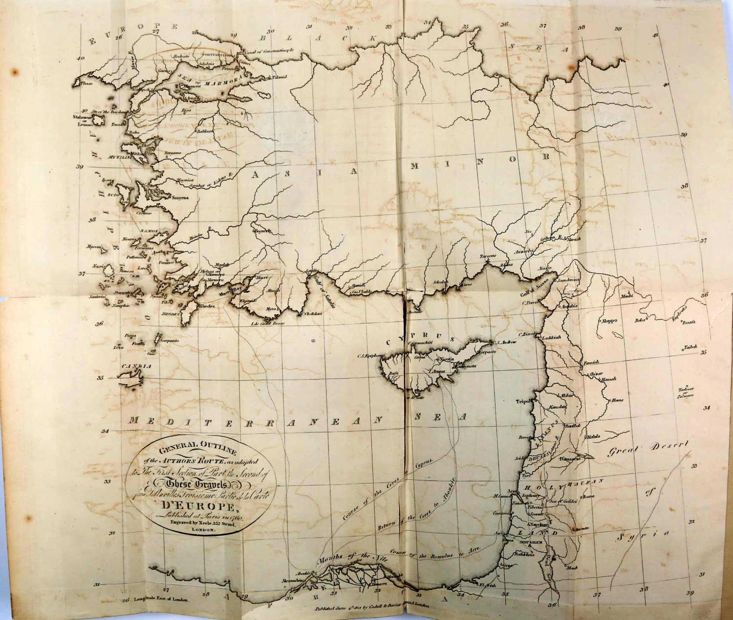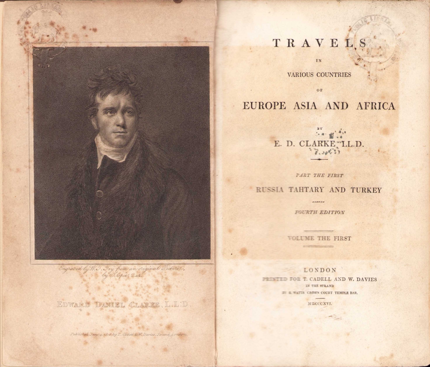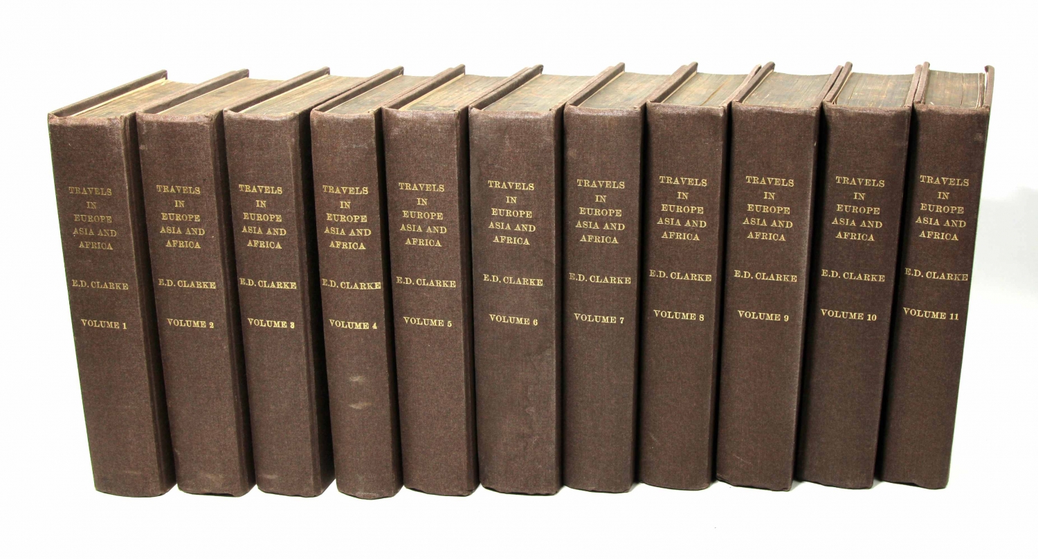 Cilt 1-2: Russia, Tartary and Turkey; Cilt 3-8: Greece, Egypt and The Holy Land; Cilt 9-11: Scandinavia), E[dward] D[aniel] CLARKE. London: T Cadell & W Davies, MDCCCXVI [1816], [22]+xi+[11]+533 s., metin dışında 1 katlanır harita; [10]+524+24 s., metin dışında 1 katlanır harita; xxvii+[9]+453 s., metin dışında 1 katlanır harita; [14]+463 s., metin dışında 1 katlanır harita; xvi+[4]+460 s., metin dışında 1 katlanır harita; [16]+647 s.; [2]+xxvi+[12]+481 s., metin dışında 1 katlanır harita; [18]+462+[60] s., metin dışında 1 katlanır harita; xvi+[15]+571 s., metin dışında 1 katlanır harita; [14]+579 s., metin dışında 1 katlanır harita; [16]+492 s., metin dışında 1 katlanır harita, 14,5x22 cm., bez ciltlerinde. - Sir Edward Daniel Clarke (1769-1822) İngiliz maden mühendisi ve seyyahıdır. Mısır ve Filistin’de heykel, elyazmaları, eski paralar ve lahitler toplamıştır. 1801’deki Mısır seferi sırasında İngiliz-Osmanlı kuvvetleri ile birlikte Mısır’a giden bilim insanı, W. R. Hamilton ile birlikte ve hiçbir resmi sıfatı olmaksızın, yalnızca tarihi eserlere karşı duyduğu sevgi nedeniyle Mısır harabelerini Fransızlar’dan korumak amacıyla 6 ay bölgede kalmıştır. Clarke’ın Büyük İskender’in mezarı olduğuna inandığı yeşil lahit Fransızlar’ın elinden bu şekilde alınabilmiştir. Clarke’ın Yunanistan, Mısır ve Kutsal Topraklar’ı, İskandinavya'yı kapsayan gezilerini içeren bu eseri oldukça önemlidir.