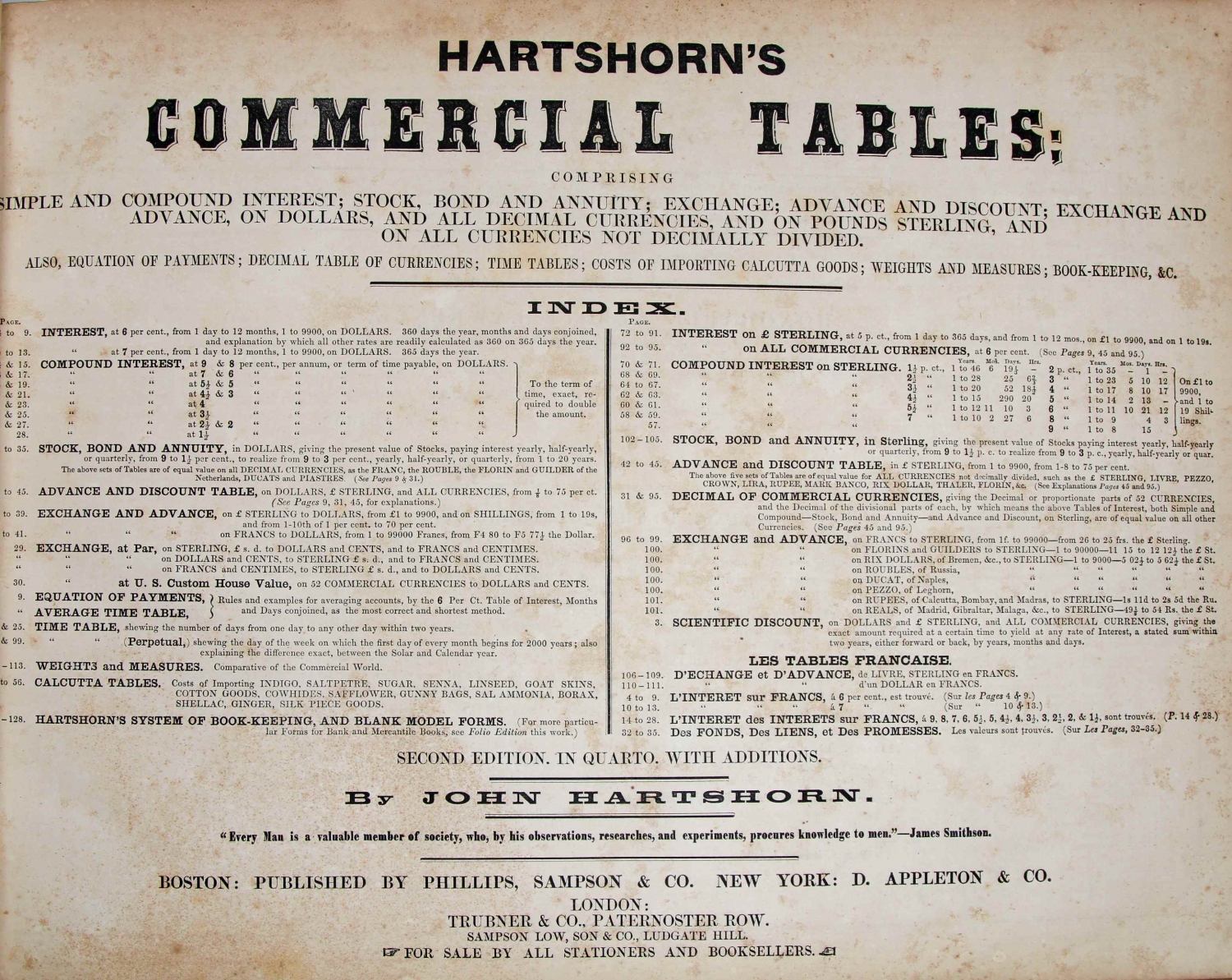 Hartshorn's Commercial Tables, John Hartshorn, İkinci baskı, Trubner& Co., Londra, 1885, İngilizce, çok nadir, 9 adet gravür bulunmaktadır. 132 sayfa, 45x34,5 cm.
