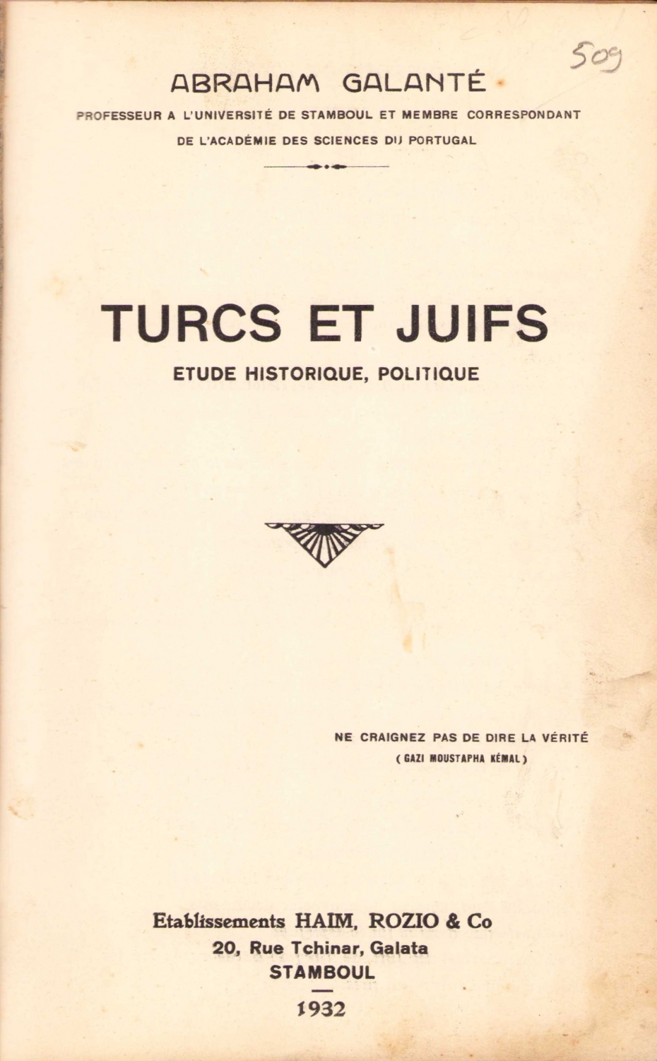 Turcs et Juifs Etude Historique Politique [Türkler ve Yahudiler], Abraham Galanté,Etablissements Haim, Razio&Co, İstanbul, 1932, Fransızca, 159 sayfa, 15,5x23 cm.