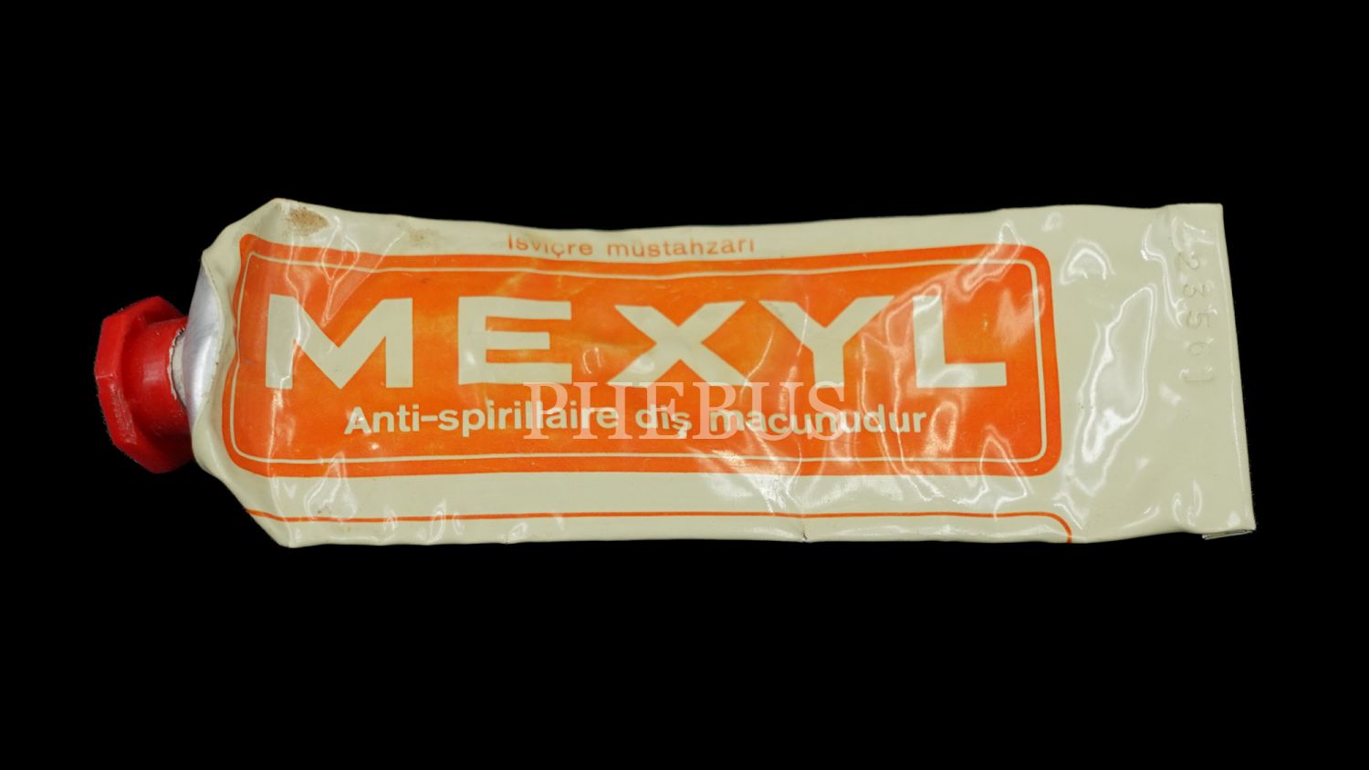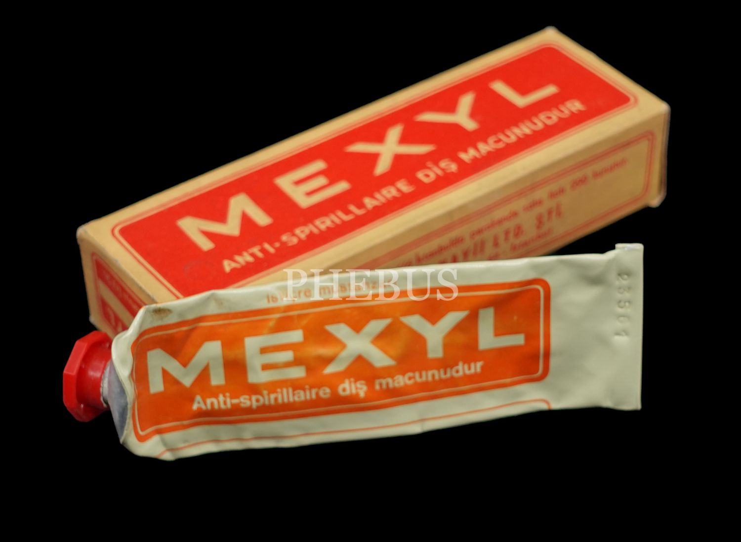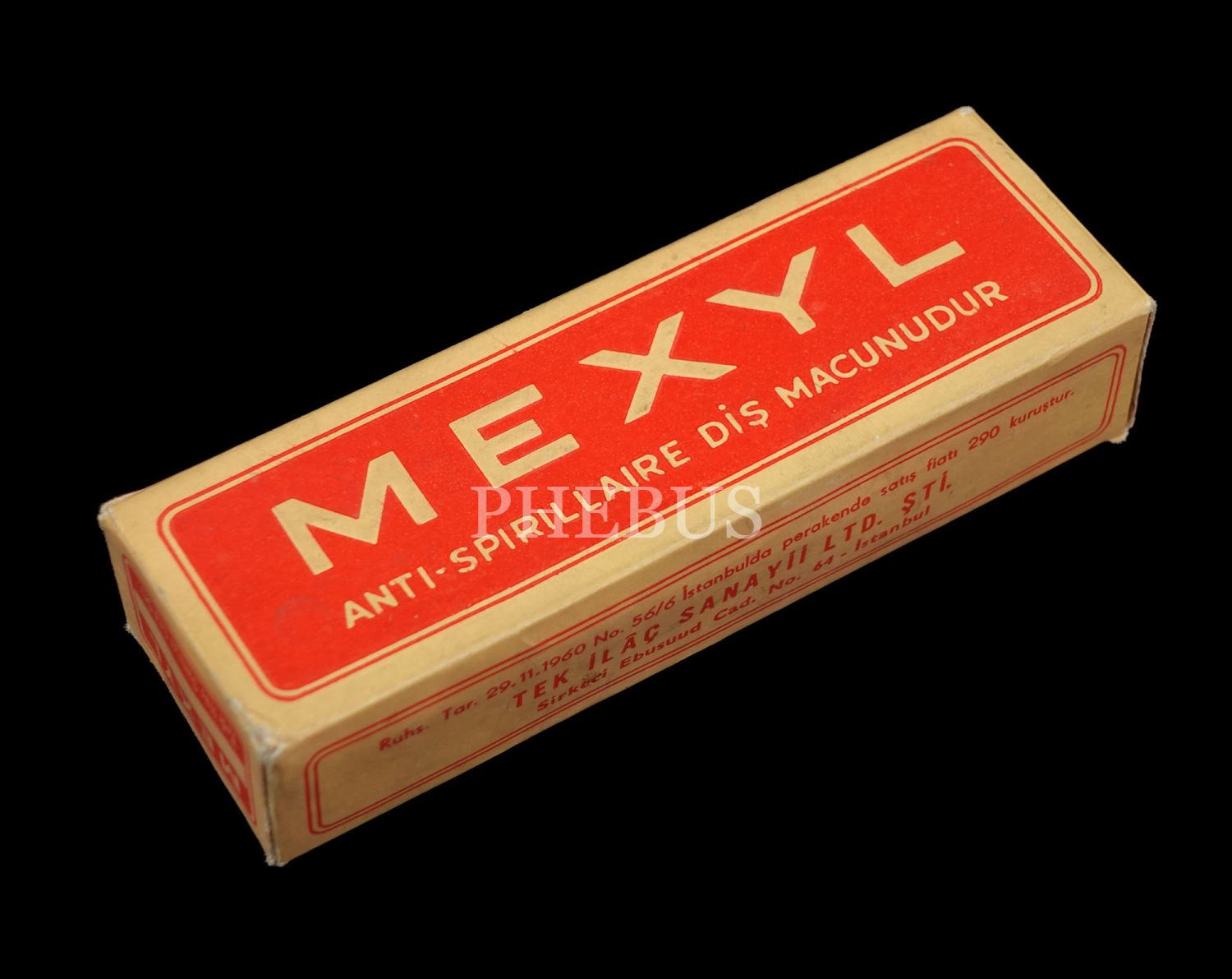 Prospektüsün de bulunduğu orijinal karton kutusunda Mexyl Diş Macunu tüpü (dolu), Tek İlâç Sanayii Ltd. Şti., kutu ölçüsü 12x4x3 cm...