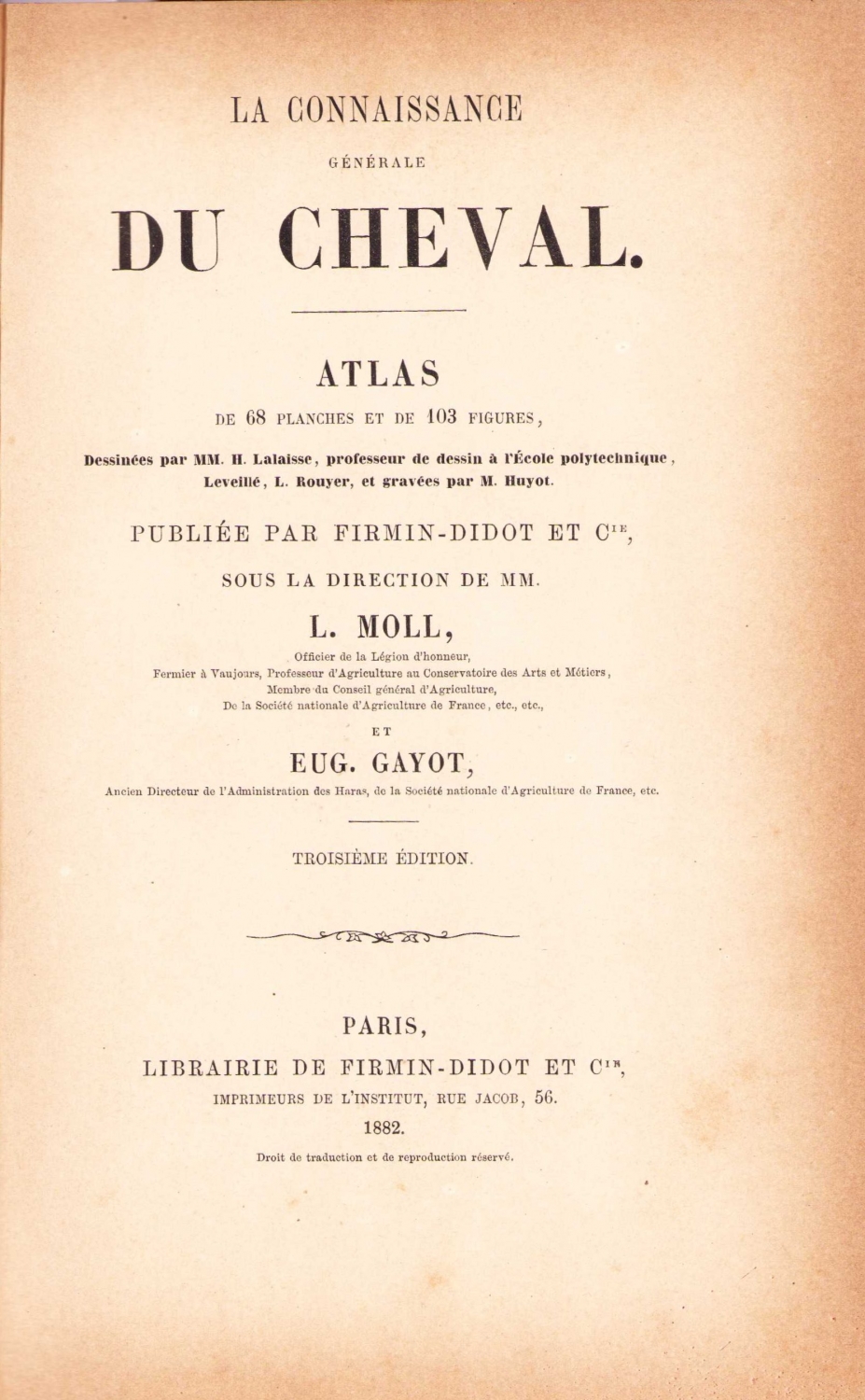 La Connaissance Generale Du Cheval Atlas, Eug. Gayot, Troisieme Edition, Paris, Librarie de Firmin-Didot Et, 1882, Fransızca, 158 sayfa, 15,5x23,5 cm.
