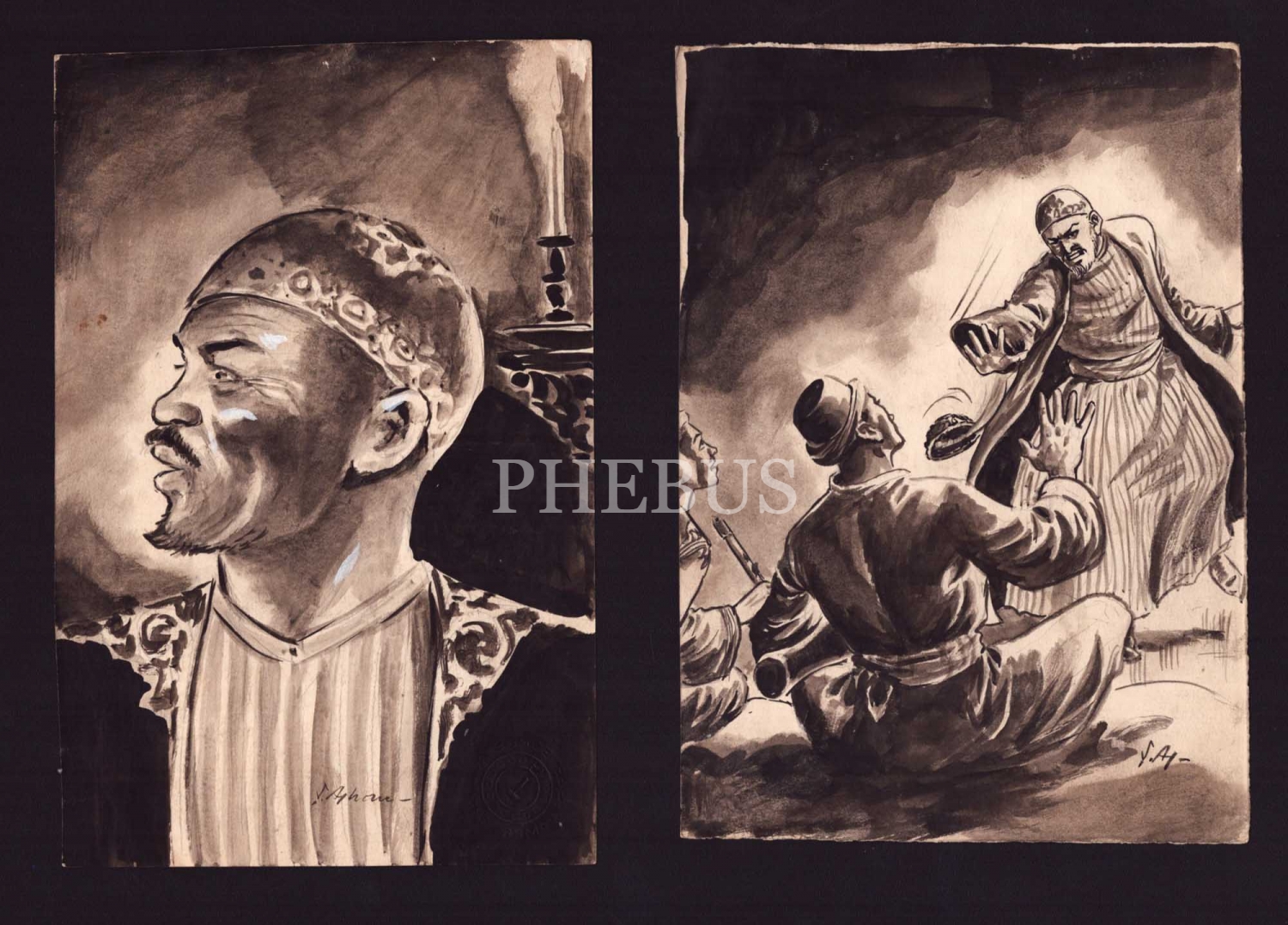 Üç adet ıslak imzalı Şahap Ayhan´dan çizgiroman çizimleri, 25x12, 15x23, 16x22 cm...