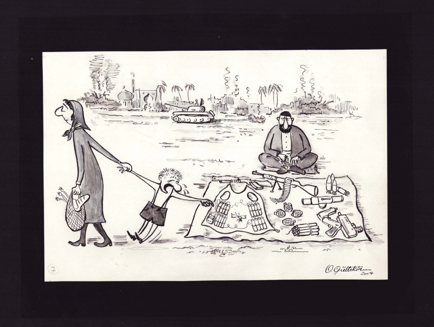 Oktay Gültekin´den ıslak imzalı Orta Doğu karikatürü, 2004, paspartusuyla birlikte 33x24 cm...