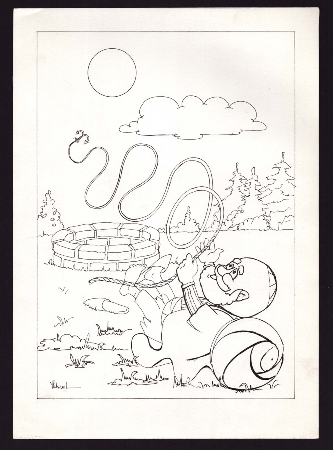 Yüksel (Ertan) ıslak imzalı kuyuya çapa atan Nasreddin Hoca konulu çizim, 25x35 cm...