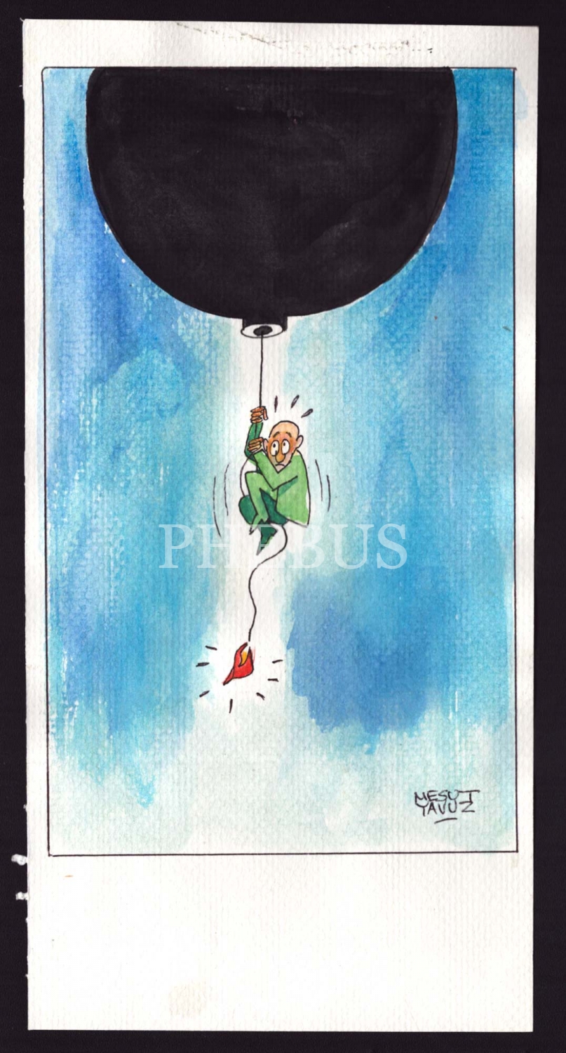 Mesut Yavuz ıslak imzalı, ateşin ve barutun arasında kalan adam konulu karikatür, 14x28 cm...