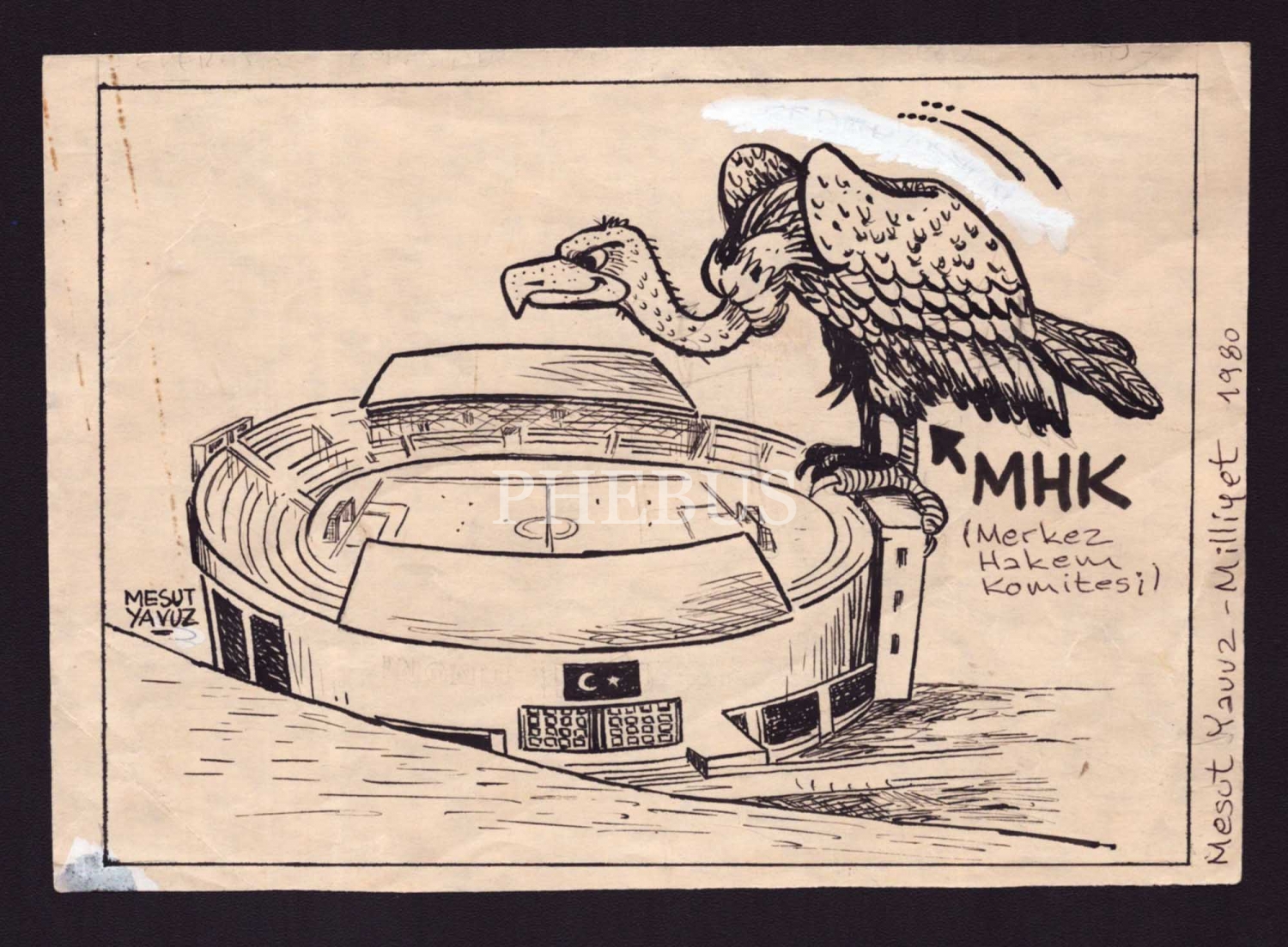 Mesut Yavuz ıslak imzalı, merkez hakem komitesinin akbaba olması konulu karikatür, 19x14 cm...