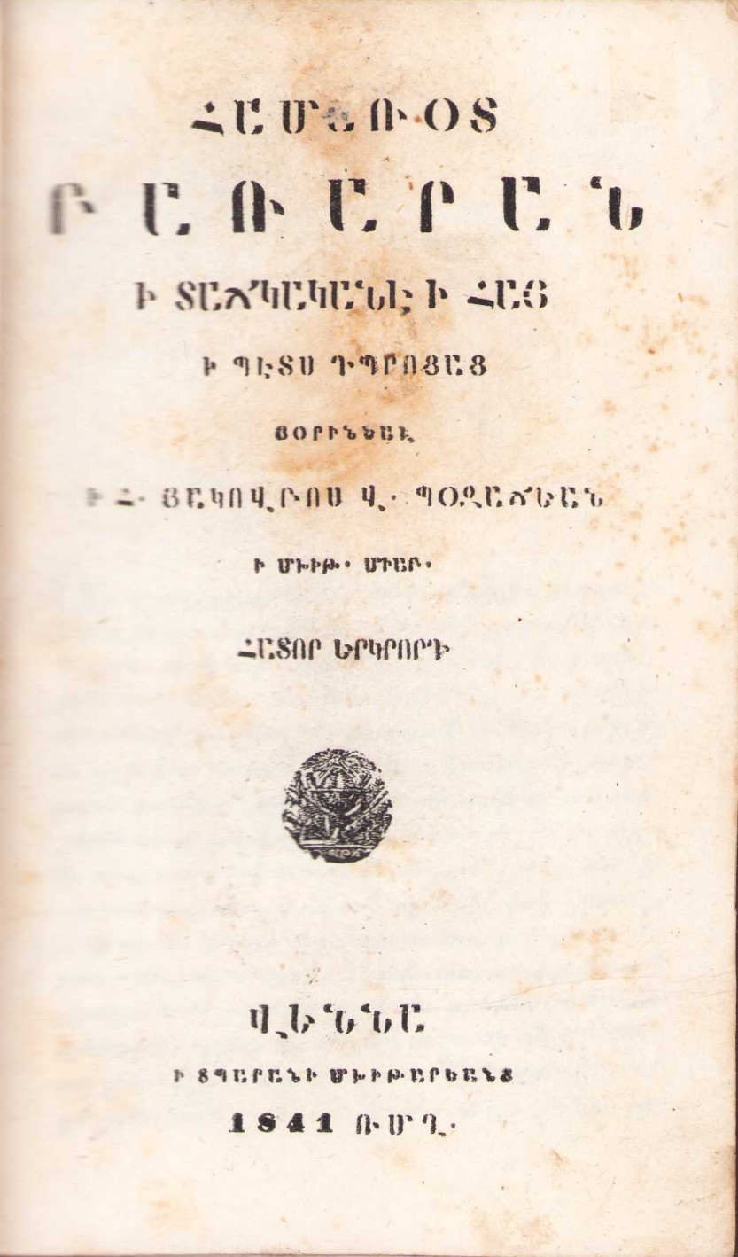 Ermenice sözlük, 1841 tarihli Kahire baskısı, 1023 sayfa, 9,5x15 cm.