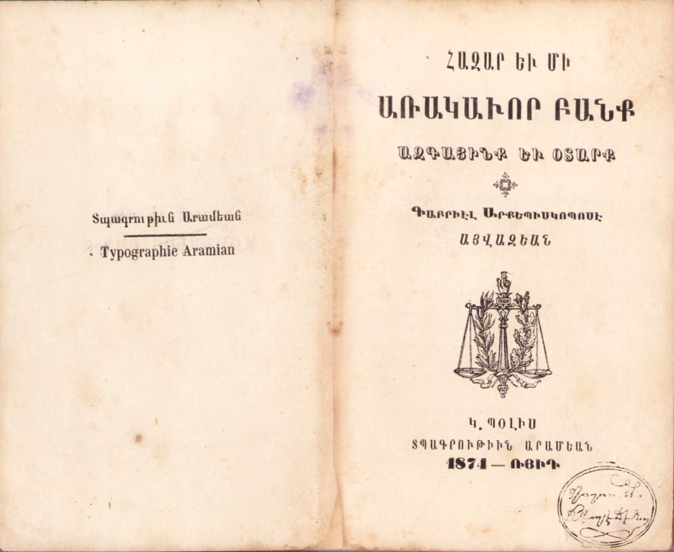 Ermenice kitap, 1874 tarihli, 287 sayfa, 7,5x12 cm.