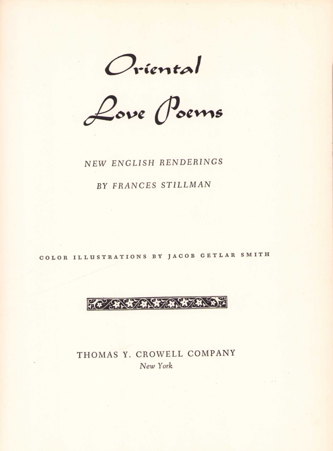 Oriental Love Poems, Frances Stillman, Jacob Getlar Smith'in illüstrasyonlarıyla, Thomas Y. Crowell Company, New York, 1951, İngilizce, 83 sayfa, 19x26 cm.