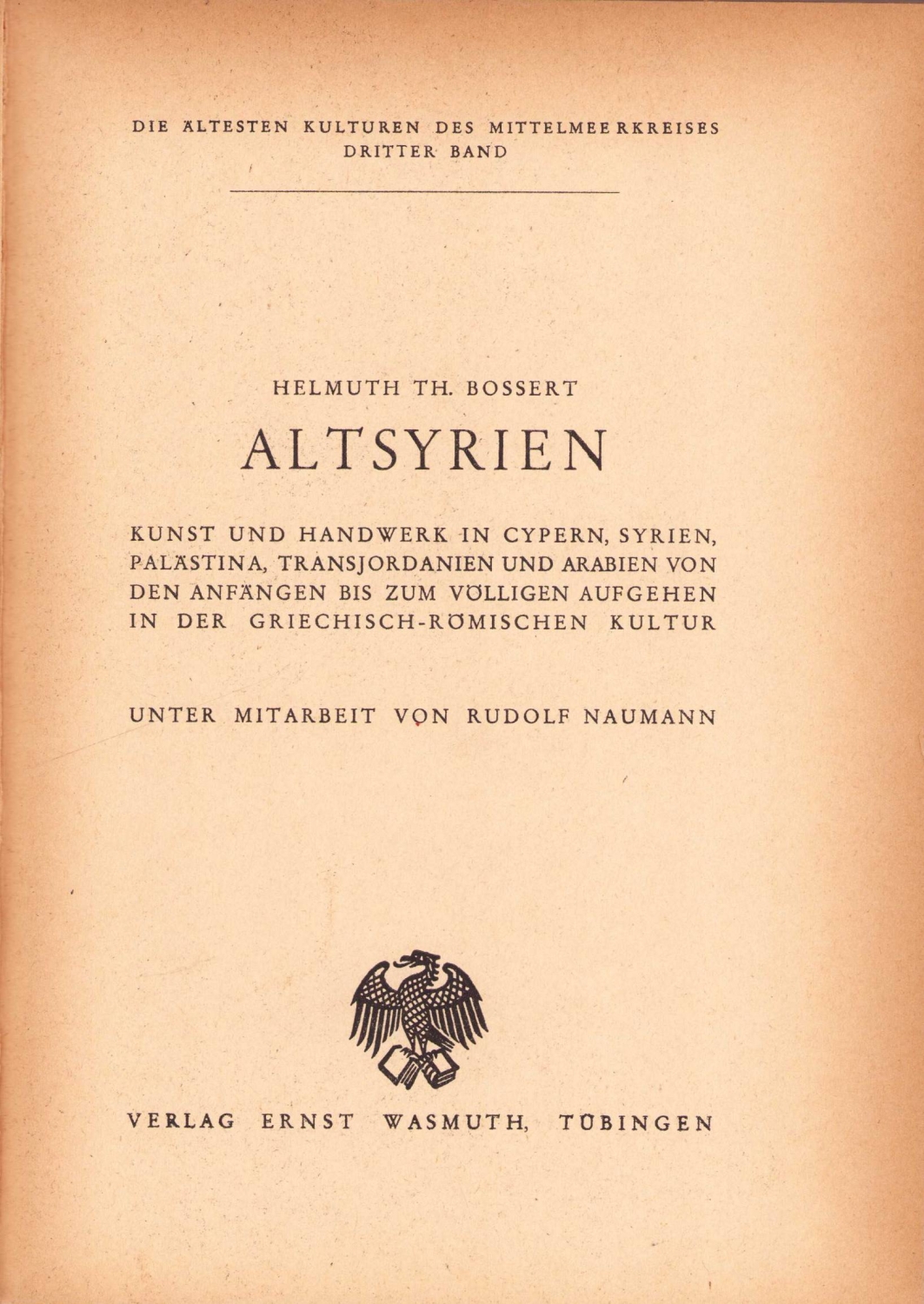 Altsyrien, Helmuth Th. Bossert, Verlag Ernst Wasmuth, Tubingen, 1951, 407 sayfa, Almanca, 17,5x27,5 cm.