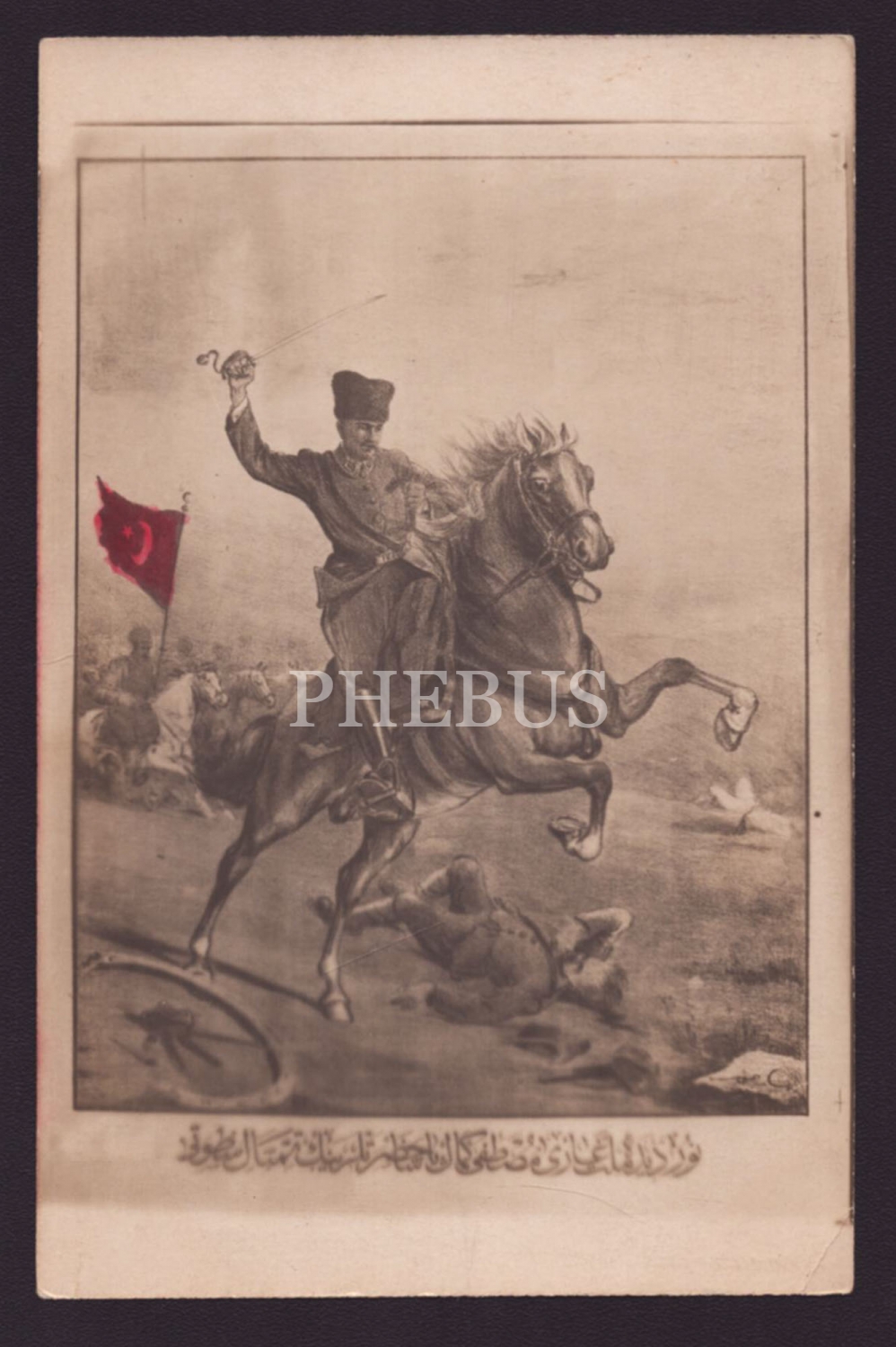 Askerinin önünde düşmana hücum eden Mustafa Kemal Atatürk görselli kartpostal, 14x9 cm...