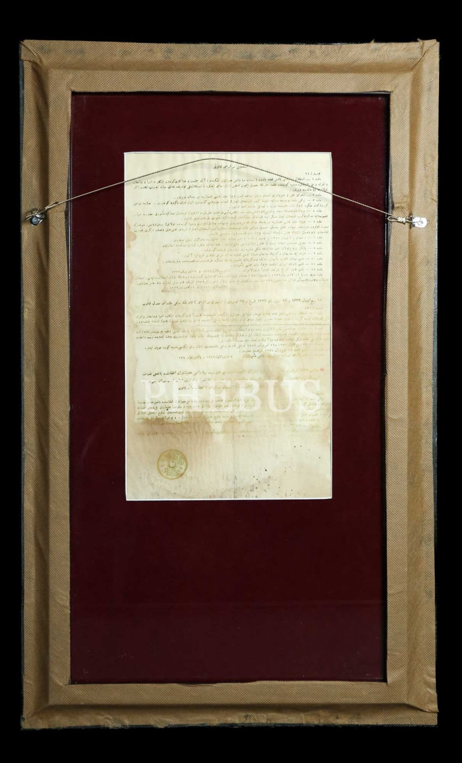 Kütahya Mudafaa-i Hukuk Cemiyeti üyelerinden Alaybeyizade Vehbi Efendi´ye verilen beyaz şeritli İstiklal Madalyası'nın Mustafa Kemal Atatürk´ün ıslak imzasını taşıyan beratı ile kırmızı şeritli İstiklal Madalyası, çerçevesiyle birlikte 40x67 cm...