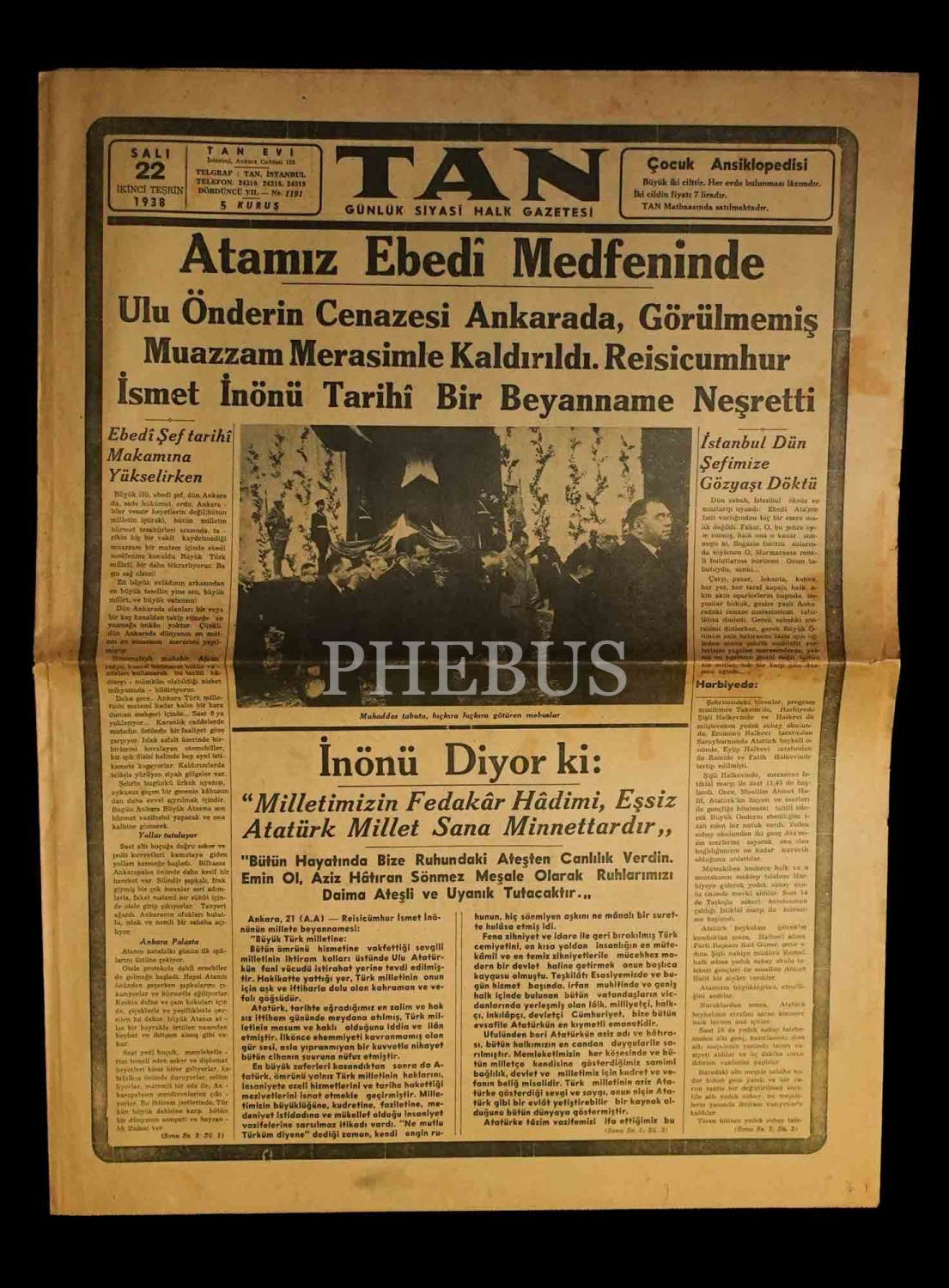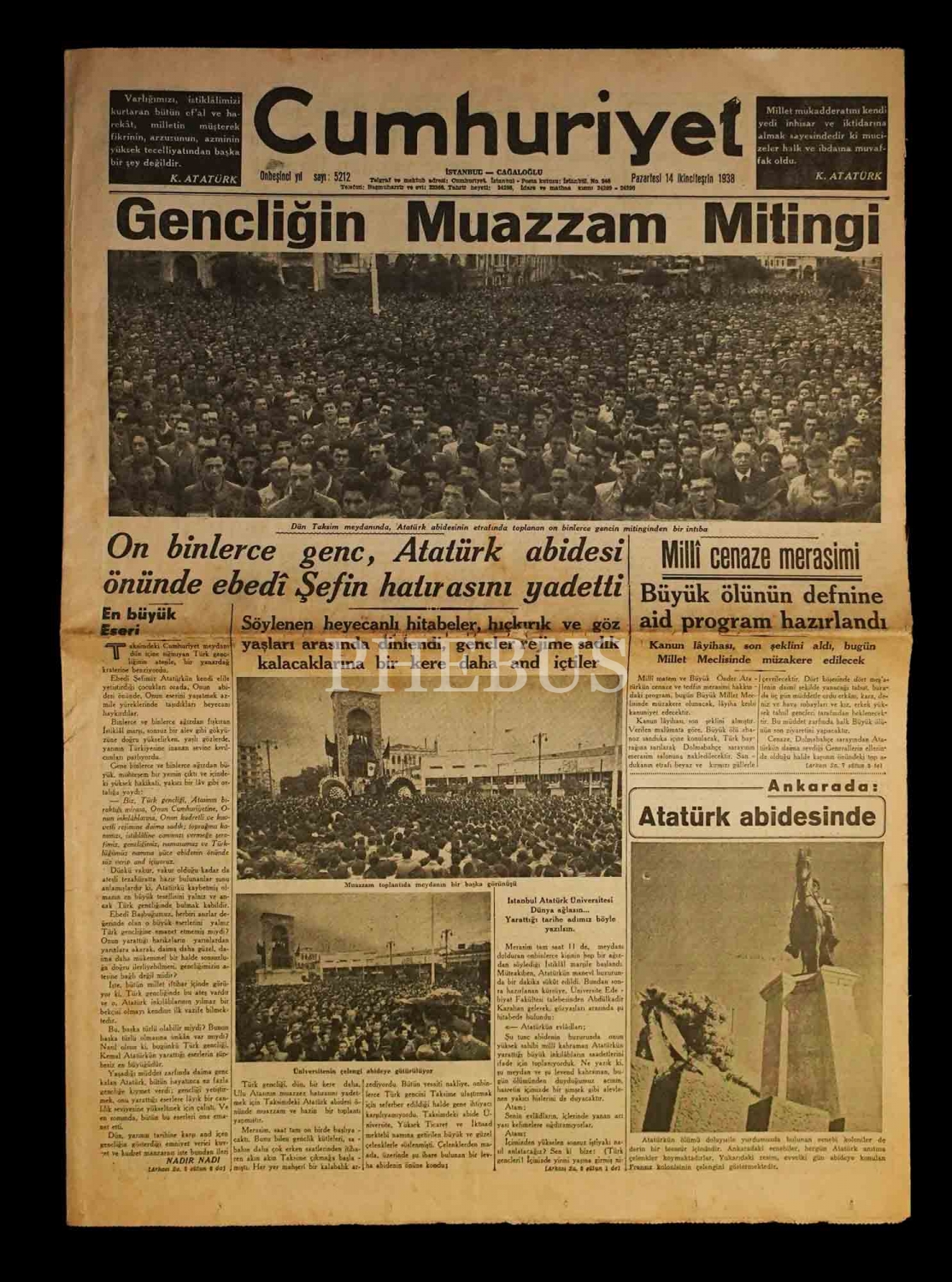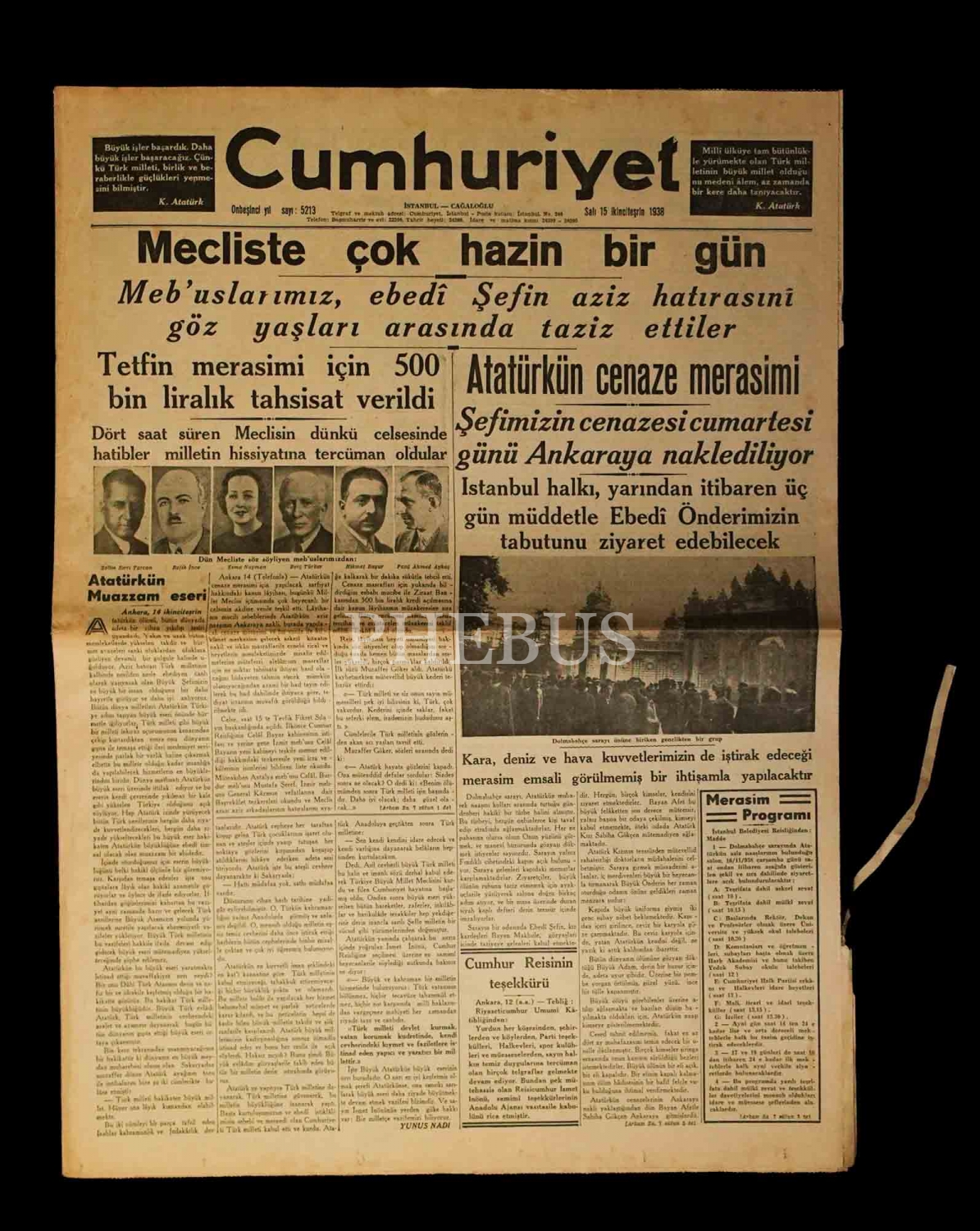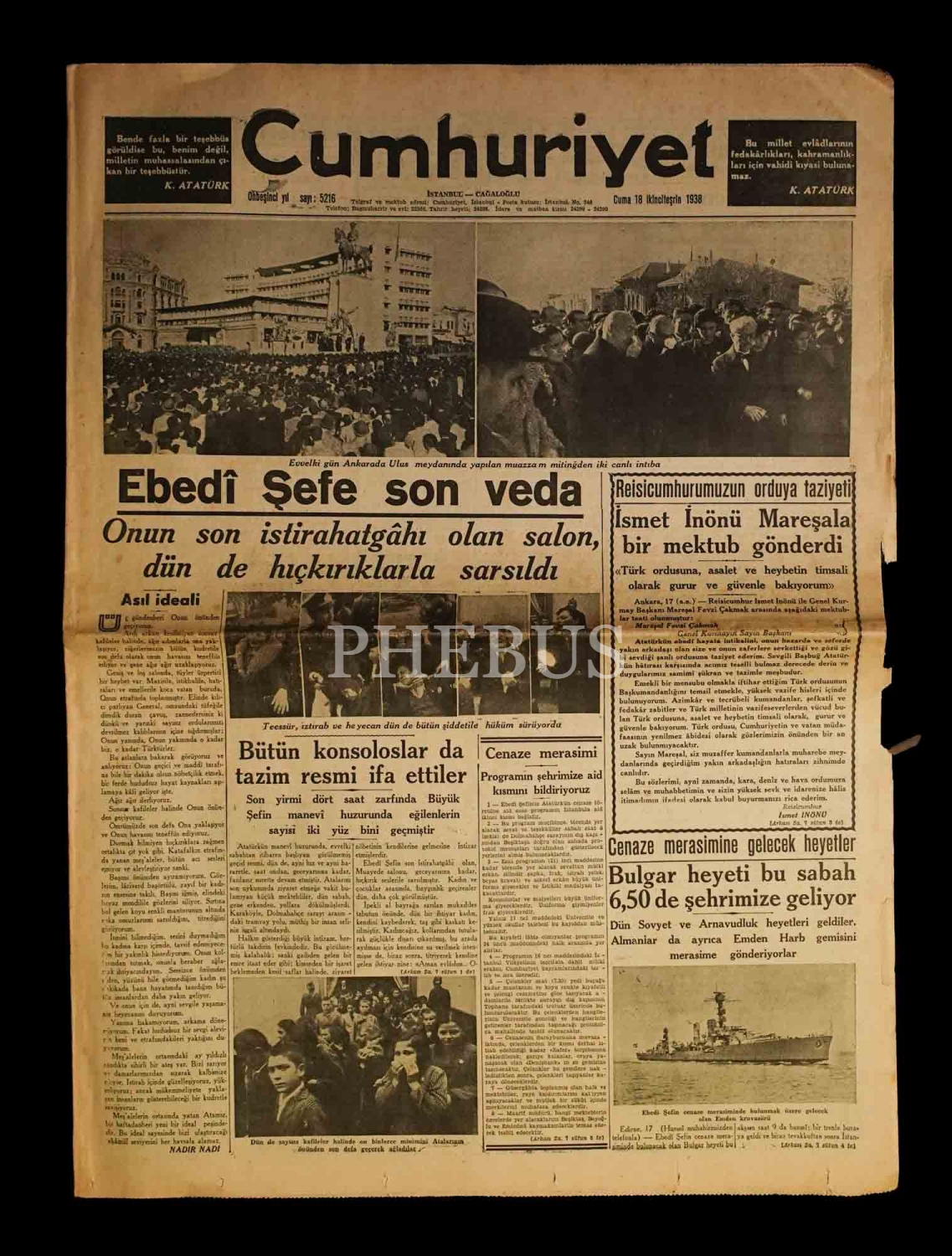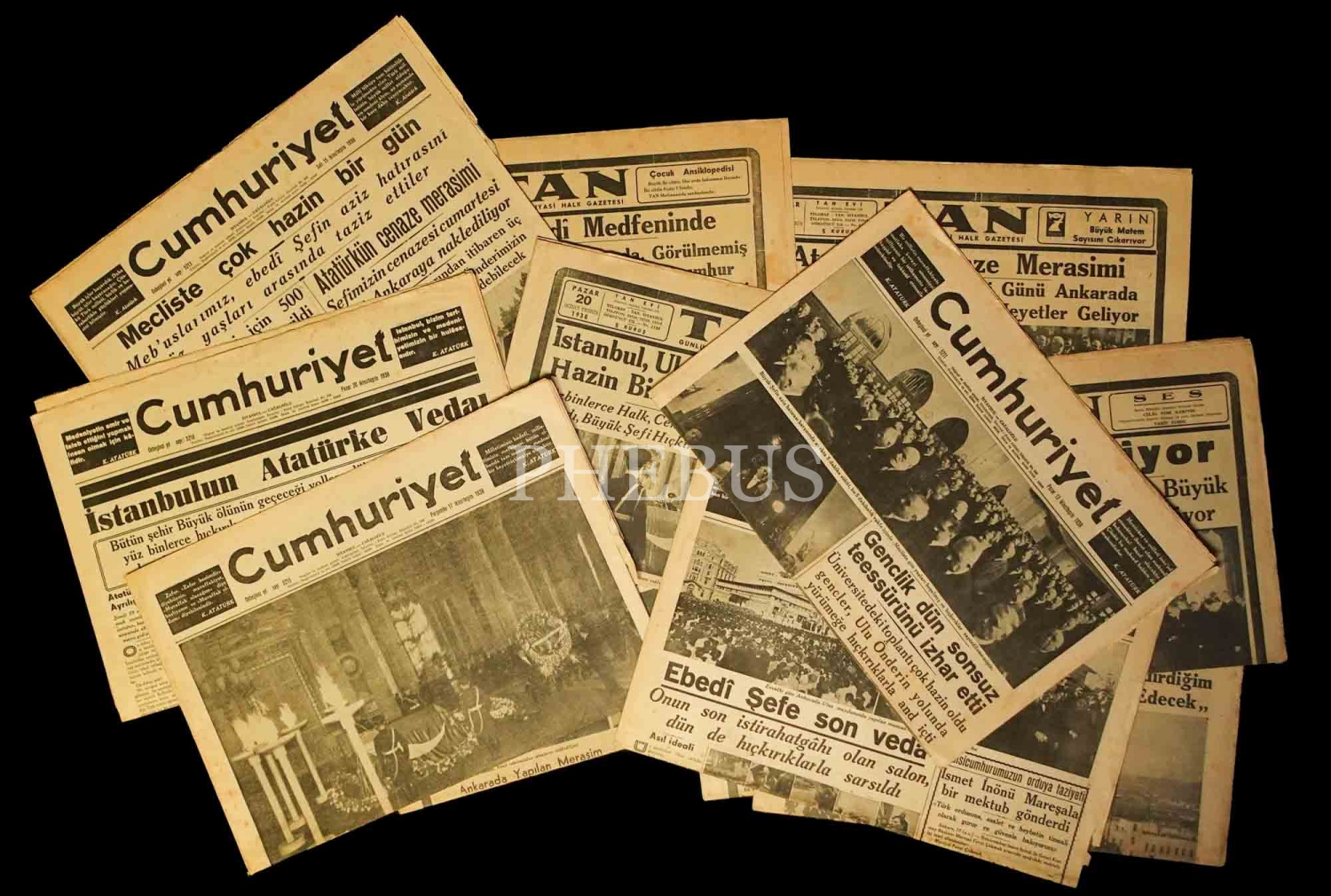 Atatürk´ün cenaze merasimi konulu 11 adet gazete (6 adet CUMHURİYET, 7 adet TAN), ortalama 45x58 cm...