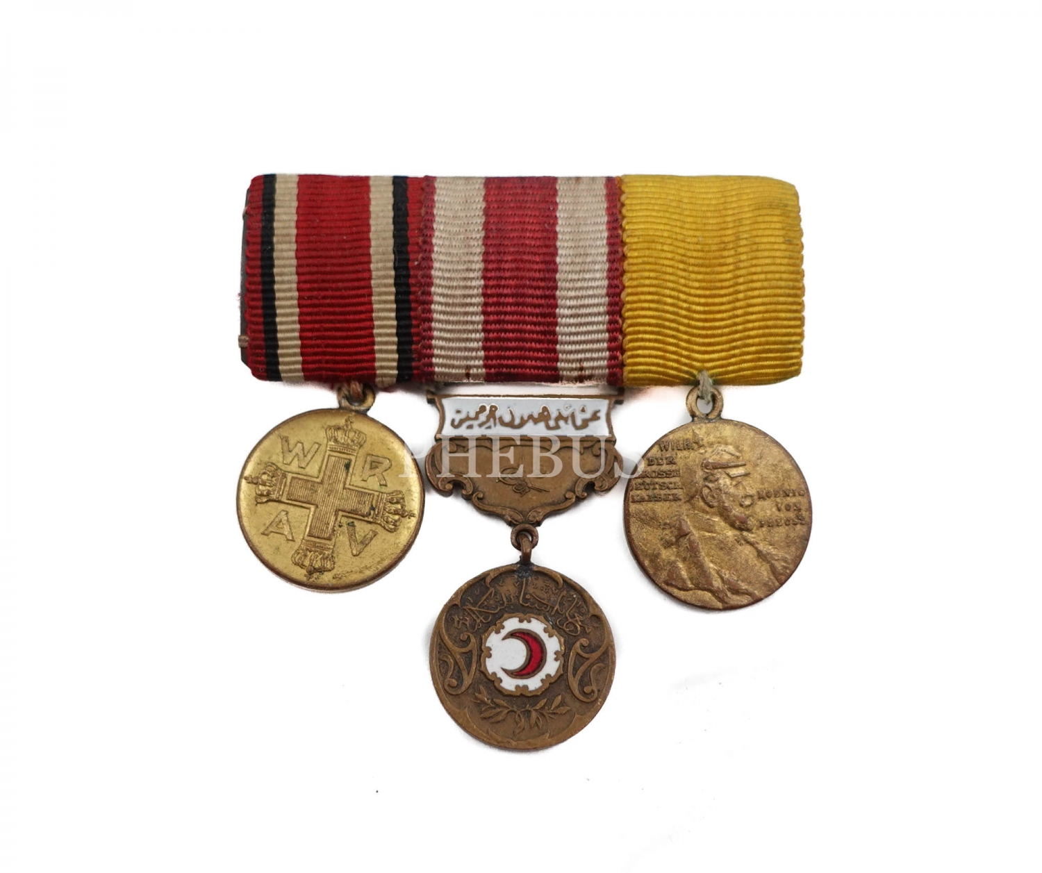Kızıl Haç Madalyası, Osmanlı Hilal-i Ahmer Madalyası ve Kaiser II. Wilhelm´in büyükbabası I. Wilhem´in doğumunun 100. yılı anısına çıkarttığı Yüzüncü Yıl Madalyası´ndan oluşan 3 madalyalık minyatür madalya barı....
