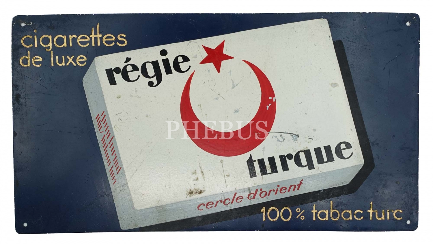 Regie sigarası reklamlı teneke tabela, "Regie Turque: Cigarettes de Luxe", 35x19 cm...