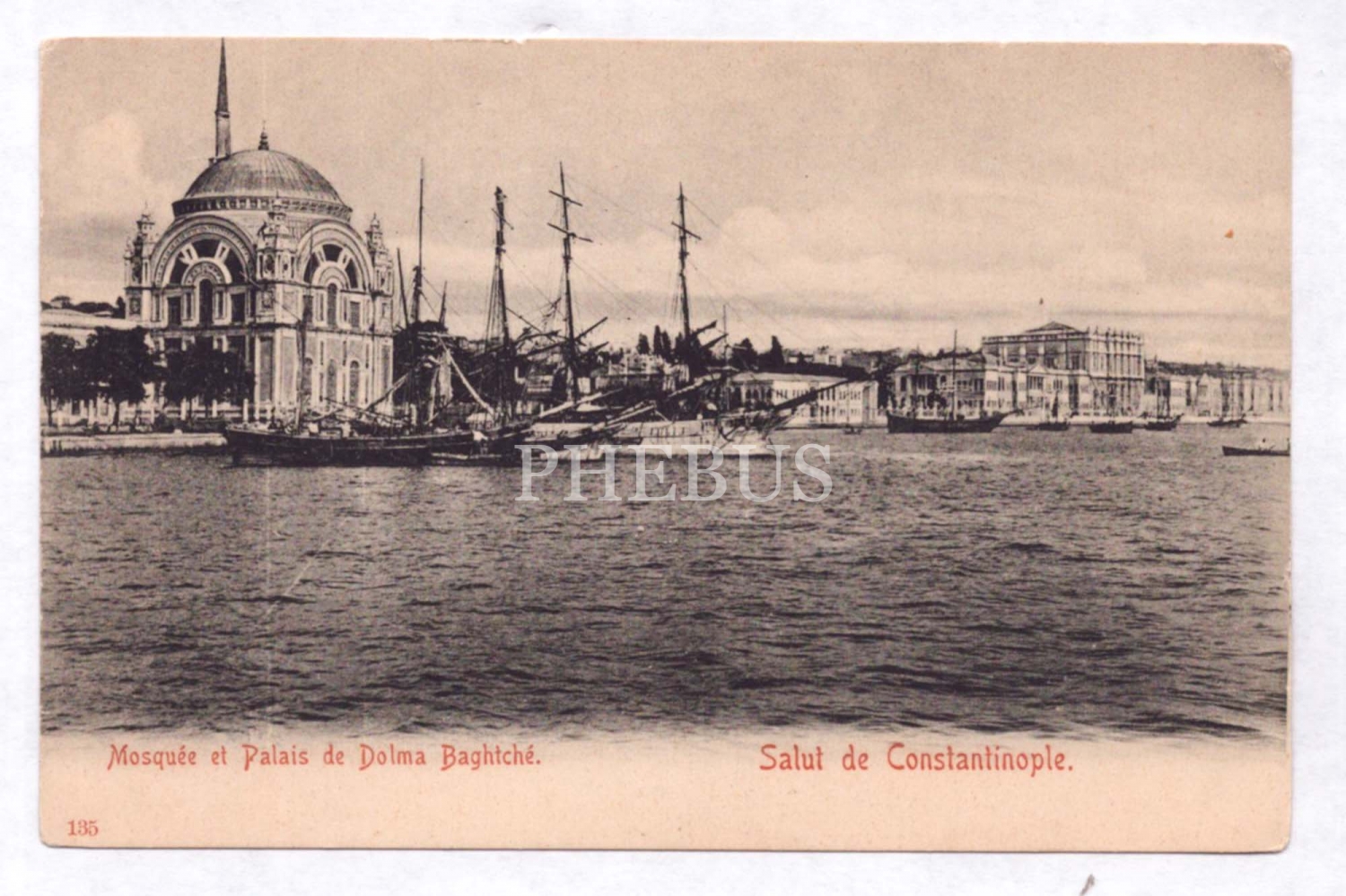 Boğazdan Dolmabahçe Camii ve Dolmabahçe Sarayı manzarası, "Mosquee et Palais de dolma-Bahgtche",14x9 cm...