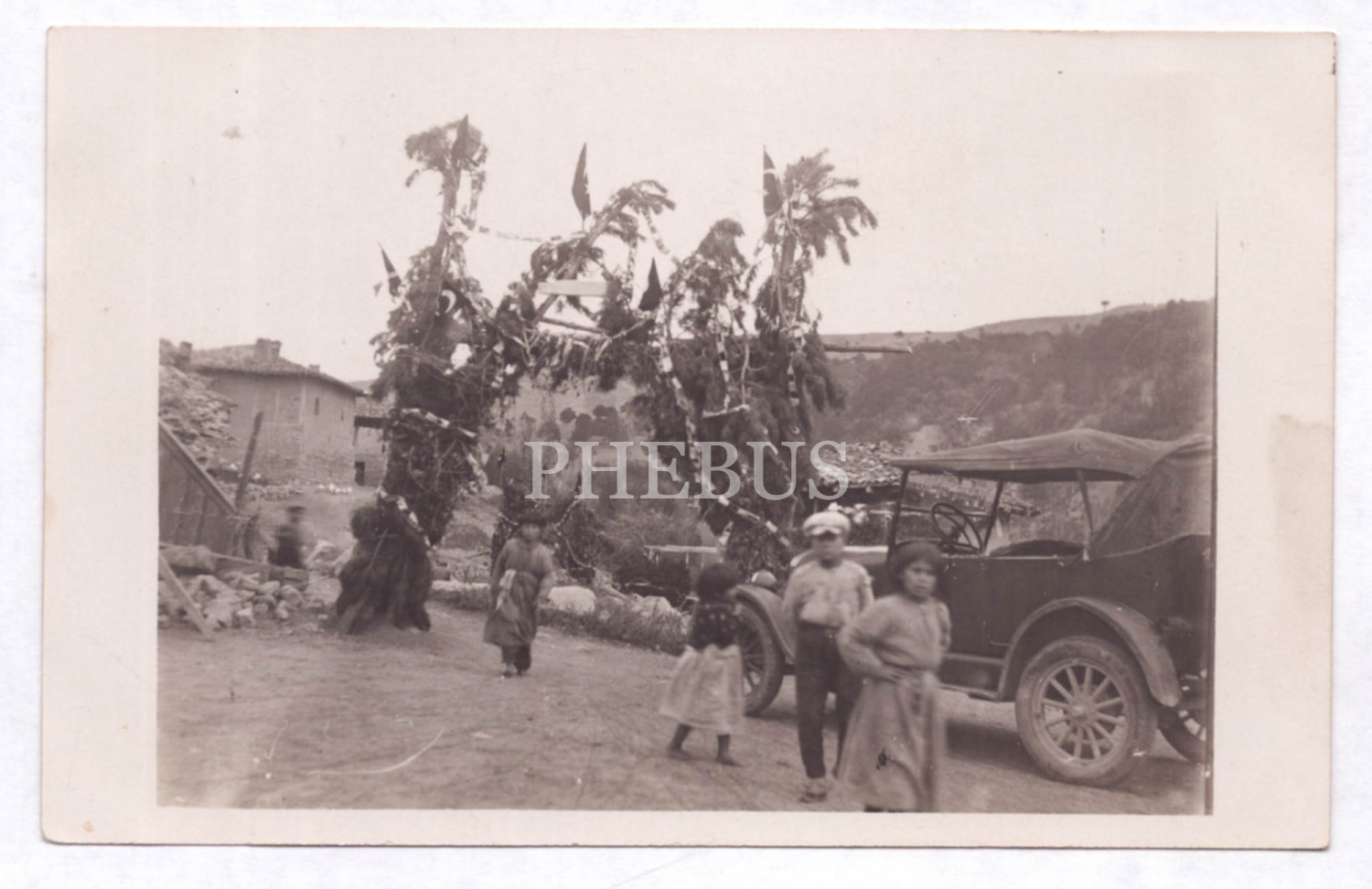 Bayram dolayısıyla köy girişine kurulan tak önünde poz veren çocuklar, 14x9 cm...